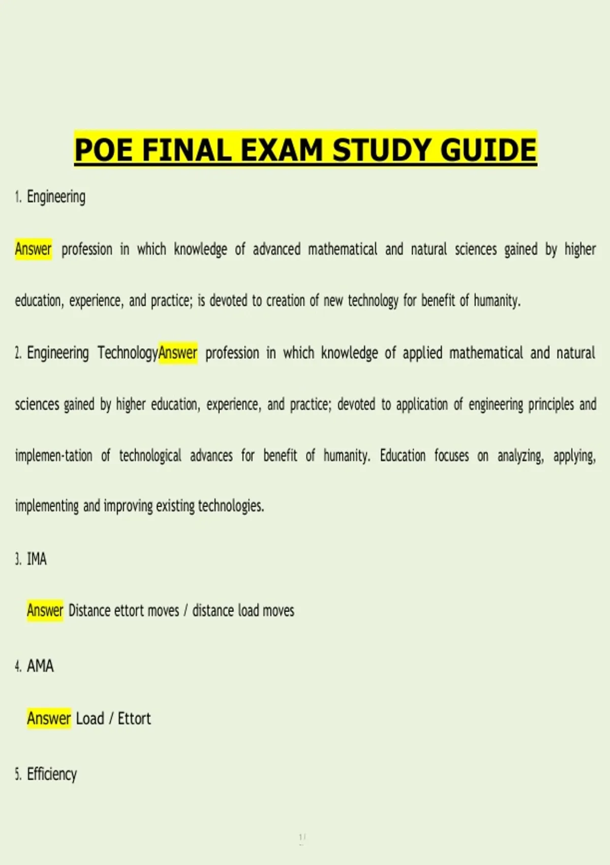 This comprehensive POE (Principles of Engineering) Final Exam Study Guide is designed to help students successfully review and master all major concepts covered throughout the course. The guide includes detailed explanations of mechanical systems, energy and power, statics and dynamics, materials science, electricity and circuits, fluid mechanics, thermodynamics, control systems, and the engineering design process. Key formulas, definitions, diagrams, and real-world engineering examples are included to reinforce understanding and improve problem-solving skills. Organized for efficient review, this resource supports exam preparation through clear concept breakdowns and practice-style questions that reflect POE assessments. Ideal for PLTW students preparing for cumulative finals, this study guide builds confidence and ensures readiness for exam day.