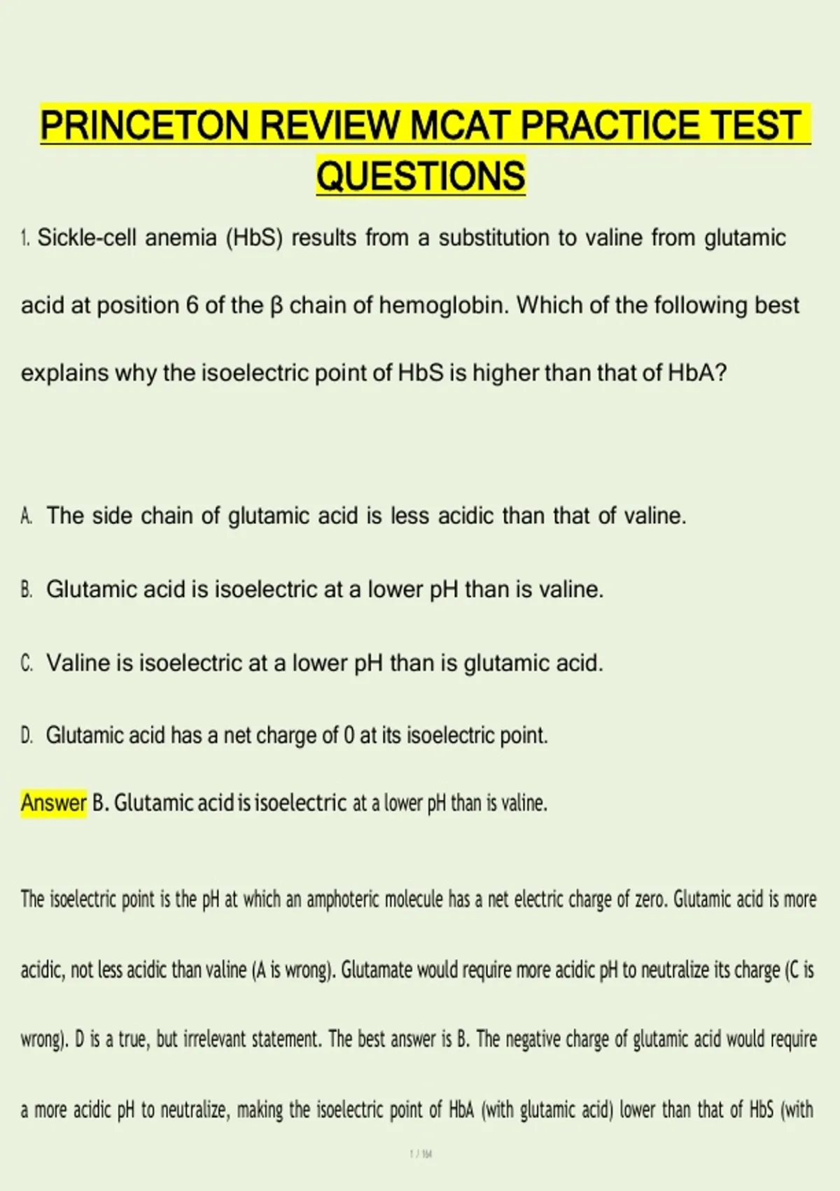 acidic, not less acidic than valine (A is wrong). Glutamate would require more acidic pH to neutralize its charge (C is
