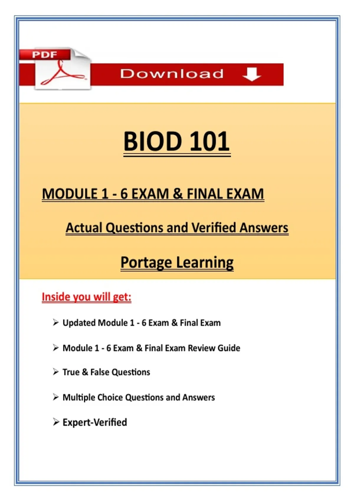 BIOD 101 Module 1–6 & Final Exam 2026 | Questions with 100% Correct Answers Complete & Review | Portage Learning Prepare confidently for BIOD 101 (Biology) Module 1–6 and the Final Exam with this Instant PDF Download, created to support students enrolled in Portage Learning courses. This comprehensive study guide includes exam-style practice questions with clear answers, detailed explanations, and focused review content covering all major BIOD 101 topics. Ideal for structured study or last-minute exam review. What You’ll Receive: Practice questions & answers covering Modules 1–6 and the Final Exam Clear explanations to reinforce key biology concepts Covers high-yield topics such as cells, metabolism, genetics, enzymes, and biological systems Instant PDF download – start studying immediately Printable and mobile-friendly format BIOD 101 exam BIOD 101 Module 1–6 BIOD 101 Final Exam Portage Learning BIOD 101 BIOD 101 study guide Biology exam prep PDF Portage Learning biology exam BIOD 101 practice questions BIOD 101 review guide Printable biology exam PDF Portage Learning BIOD exam BIOD 101 questions and answers Instant biology exam download College biology exam prep BIOD 101 test prep