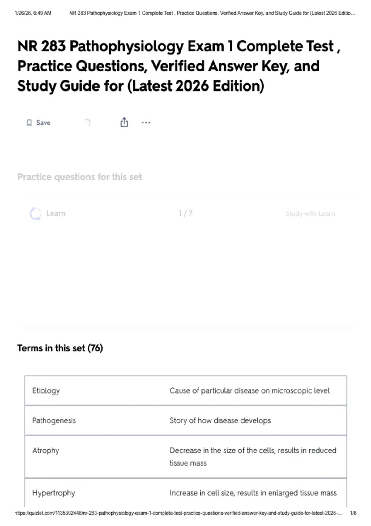 , 1/26/26, 6:49 AM NR 283 Pathophysiology Exam 1 Complete Test , Practice Questions, Verified Answer Key, and Study Guide for (Latest 2026 Editio…