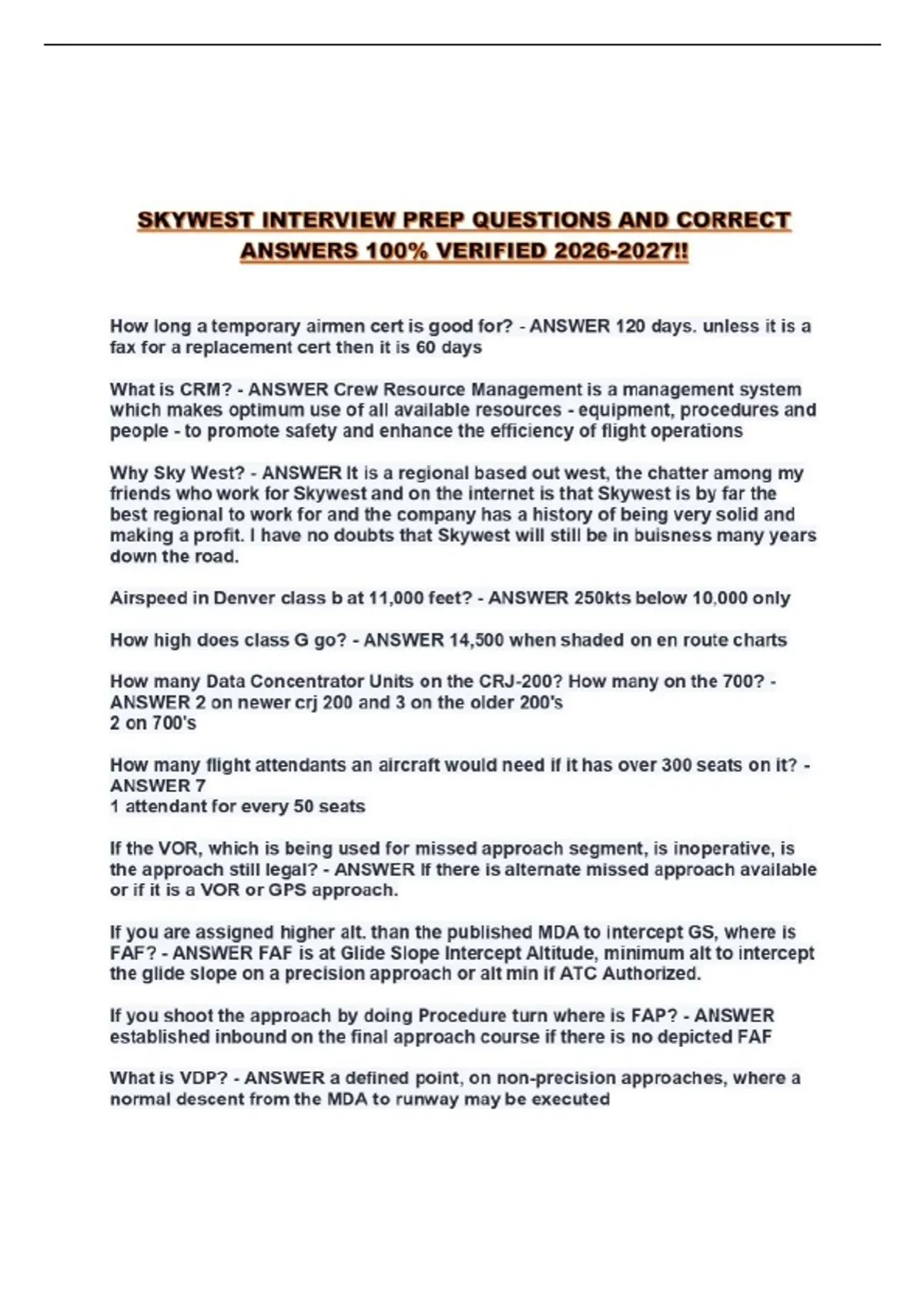 SKYWEST INTERVIEW PREP QUESTIONS AND CORRECT ANSWERS 100% VERIFIED !!...