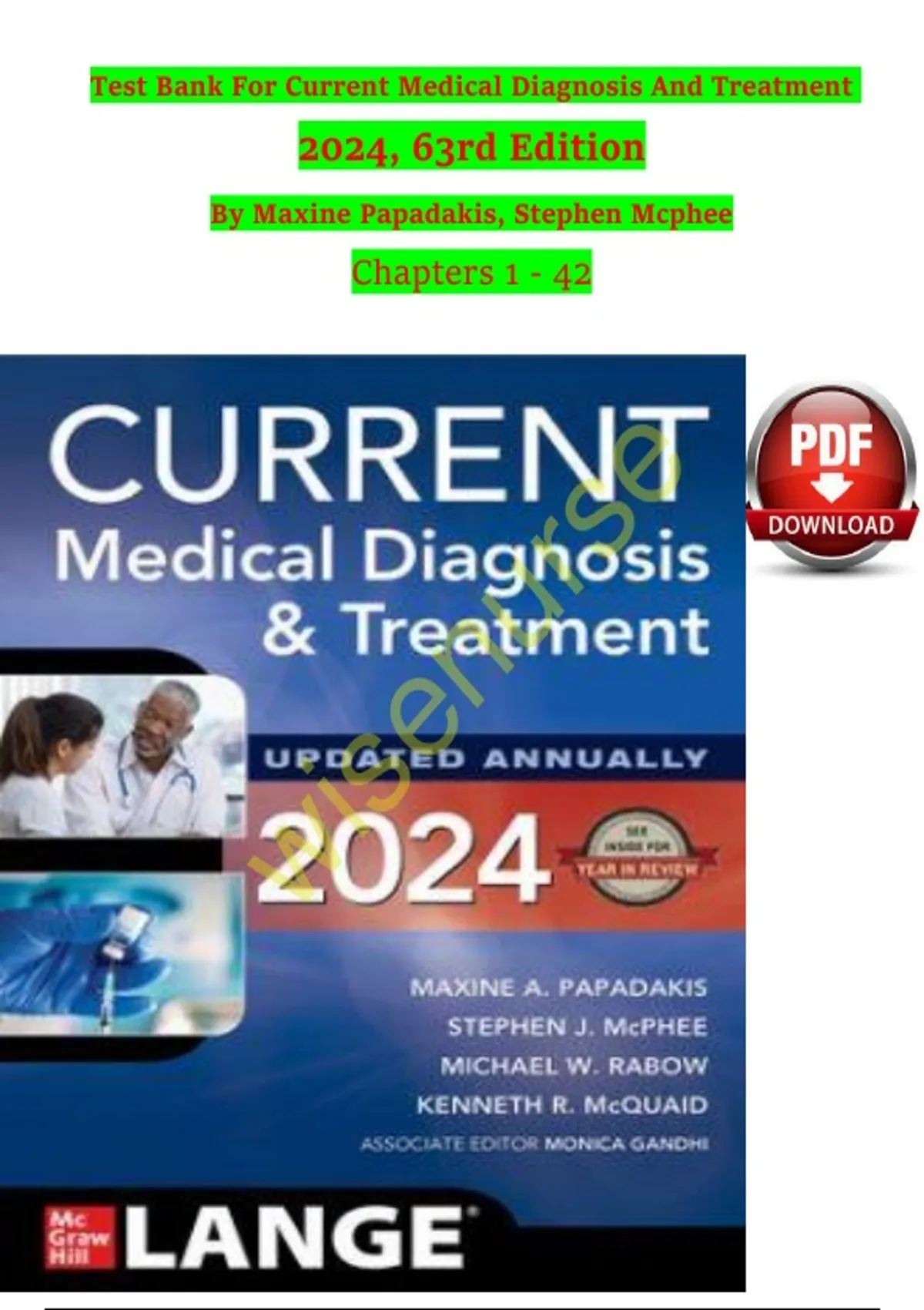 The Test Bank for Current Medical Diagnosis and Treatment, 63rd Edition by Maxine Papadakis is a comprehensive clinical study resource covering Chapters 1 through 42 of the widely used CMDT textbook. This test bank is designed for medical students, nursing students, physician assistant learners, and other healthcare trainees seeking structured, exam-focused practice aligned with core clinical medicine content. It features an extensive collection of clinically oriented multiple-choice questions with verified answers, closely reflecting the depth and scope of the textbook chapters. Coverage includes foundational principles of diagnosis and treatment, preventive medicine, infectious diseases, cardiovascular disorders, respiratory conditions, gastrointestinal and hepatobiliary diseases, renal and genitourinary disorders, endocrine and metabolic conditions, haematologic disorders, rheumatologic and musculoskeletal diseases, neurological conditions, dermatologic disorders, and selected psychiatric topics. Each question is crafted to reinforce clinical reasoning, differential diagnosis, and evidence-based management strategies, supporting safe and effective patient care. This test bank is ideal for quiz and examination preparation, clinical rotation review, and comprehensive medical knowledge assessment. It helps learners identify weak areas, improve diagnostic accuracy, and build confidence in applying medical concepts in academic and clinical settings. A valuable study aid for students preparing for medical school exams, USMLE-style assessments, and other healthcare licensing or certification examinations.