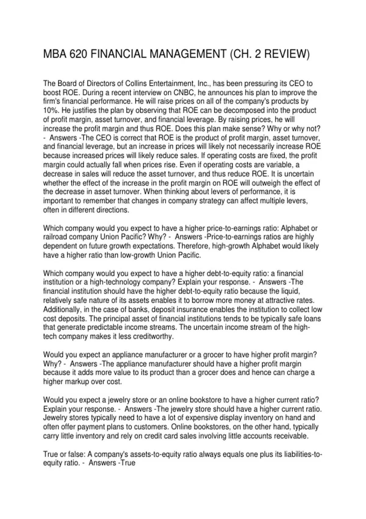 - Answers -The CEO is correct that ROE is the product of profit margin, asset turnover,