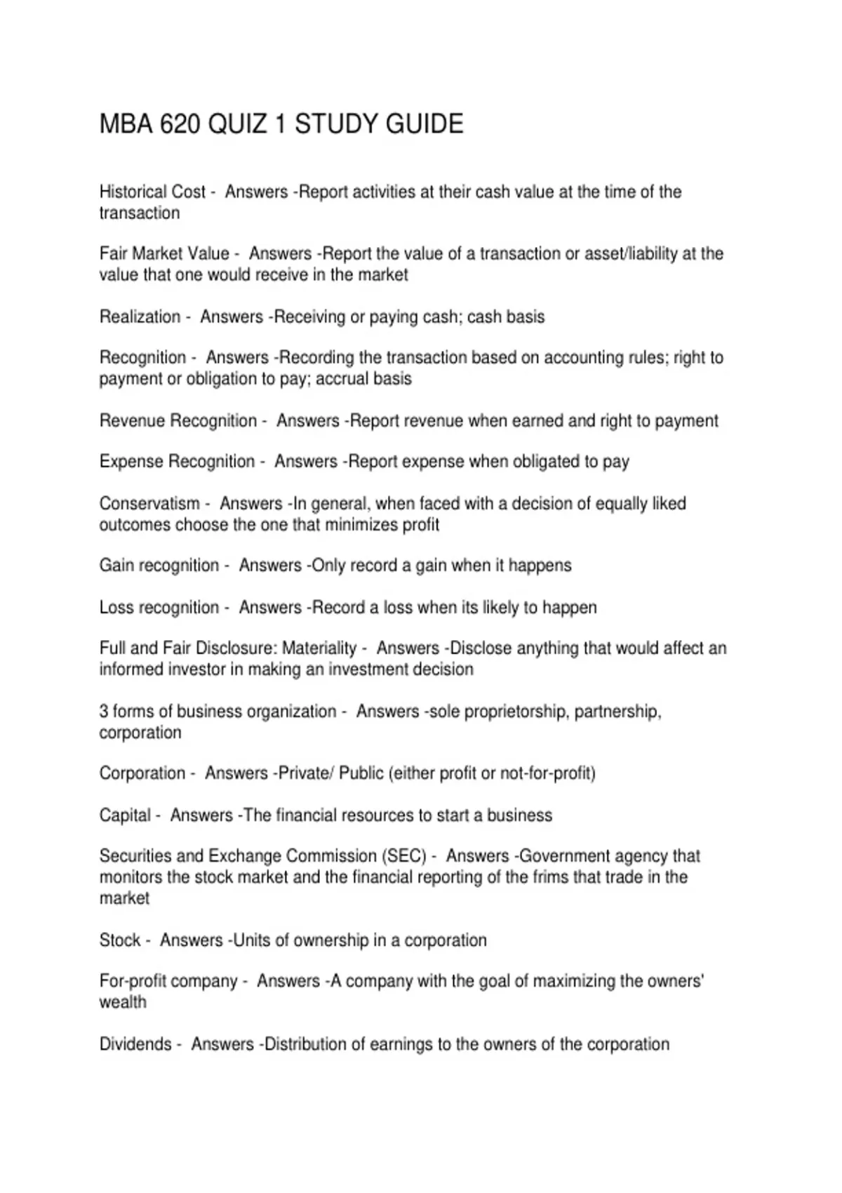 MBA 620 QUIZ 1 STUDY GUIDE