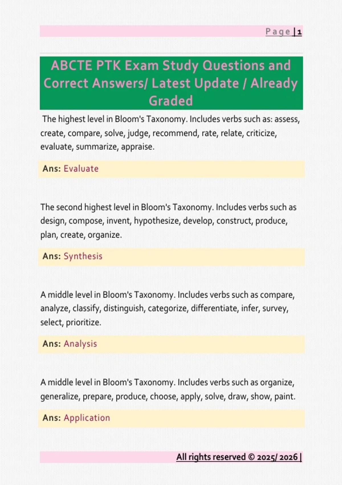 This study guide includes ABCTE PTK exam questions with correct answers covering Bloom’s Taxonomy, curriculum design, lesson planning, assessment strategies, pedagogy, and classroom management. It is aligned with ABCTE principles for prospective and practicing educators.