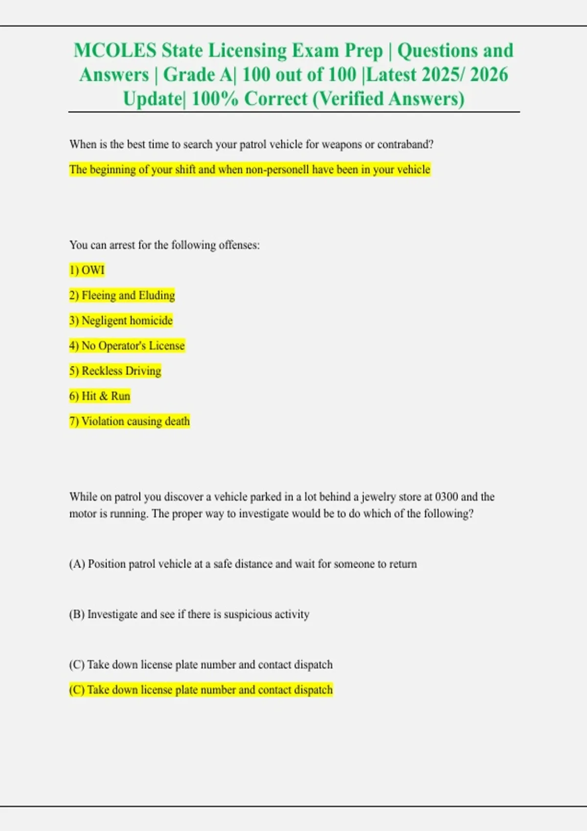 This document contains MCOLES state licensing exam questions with verified answers covering patrol procedures, arrest authority, use of force, search and seizure, emergency response, firearms safety, and legal decision-making for law enforcement officers.