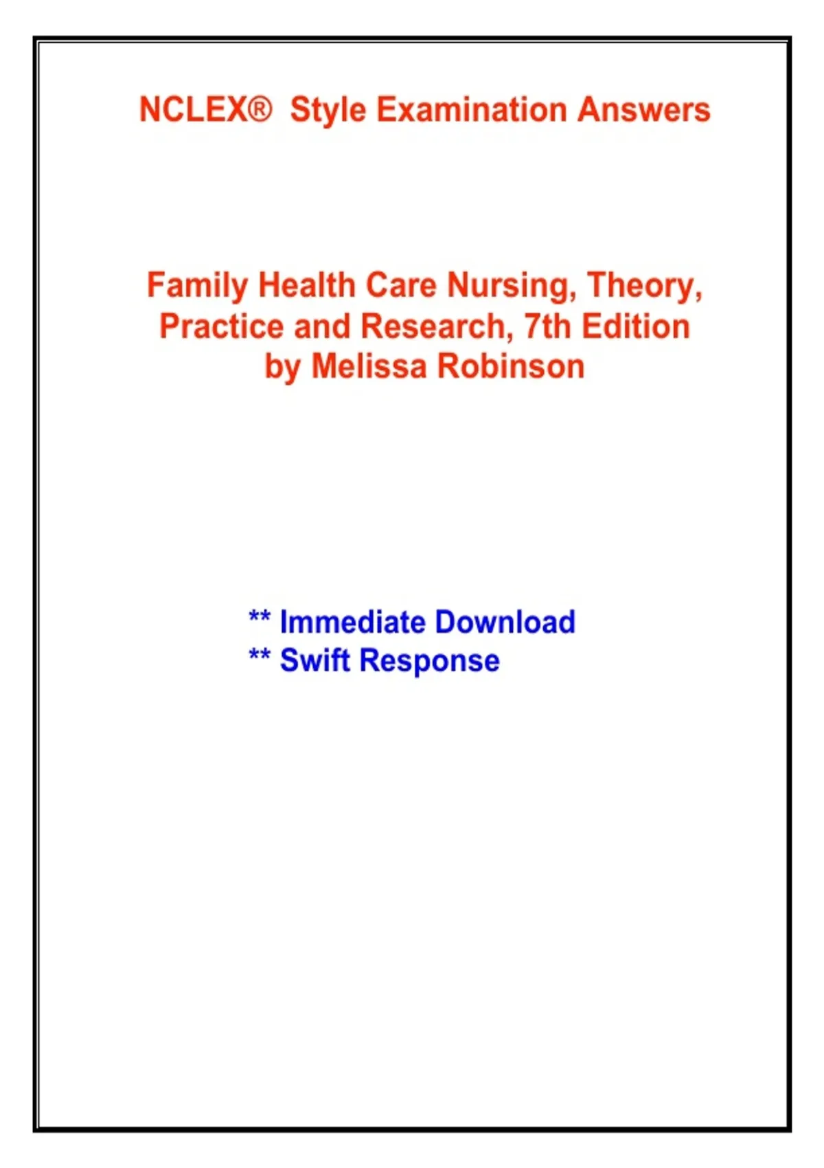 NCLEX®-Style Examination Answers for Family Health Care Nursing, Theory, Practice, and Research, 7th Edition by Melissa Robinson, Deborah Padgett Coehlo ; ISBN13: 9781719642965...1. Family Health Care Nursing: An Introduction 2. Theoretical Foundations for the Nursing of Families 3. Family Demography: Continuity and Change in North American Families 4. Families and Health Policy: The Intersection of Family Policies, Health Disparities, and Health Care Policies 5. Family Nursing Assessment and Intervention 6. Environmental Health and Families 7. Family Health Promotion 8. Nursing Care of LGBTQ 9. Genomics and Family Nursing Across the Life Span 10. Families Living With Chronic Illness 11. Families in Palliative and End-of-Life Care 12. Trauma and Family Nursing 13. Relational Nursing and Family Nursing in Canada 14. Family Nursing With Childbearing Families 15. Family Child Health Nursing 16. Family Nursing in Acute Care Adult Settings 17. Families and Aging 18. Family Mental Health Nursing 19. Families and Population Health