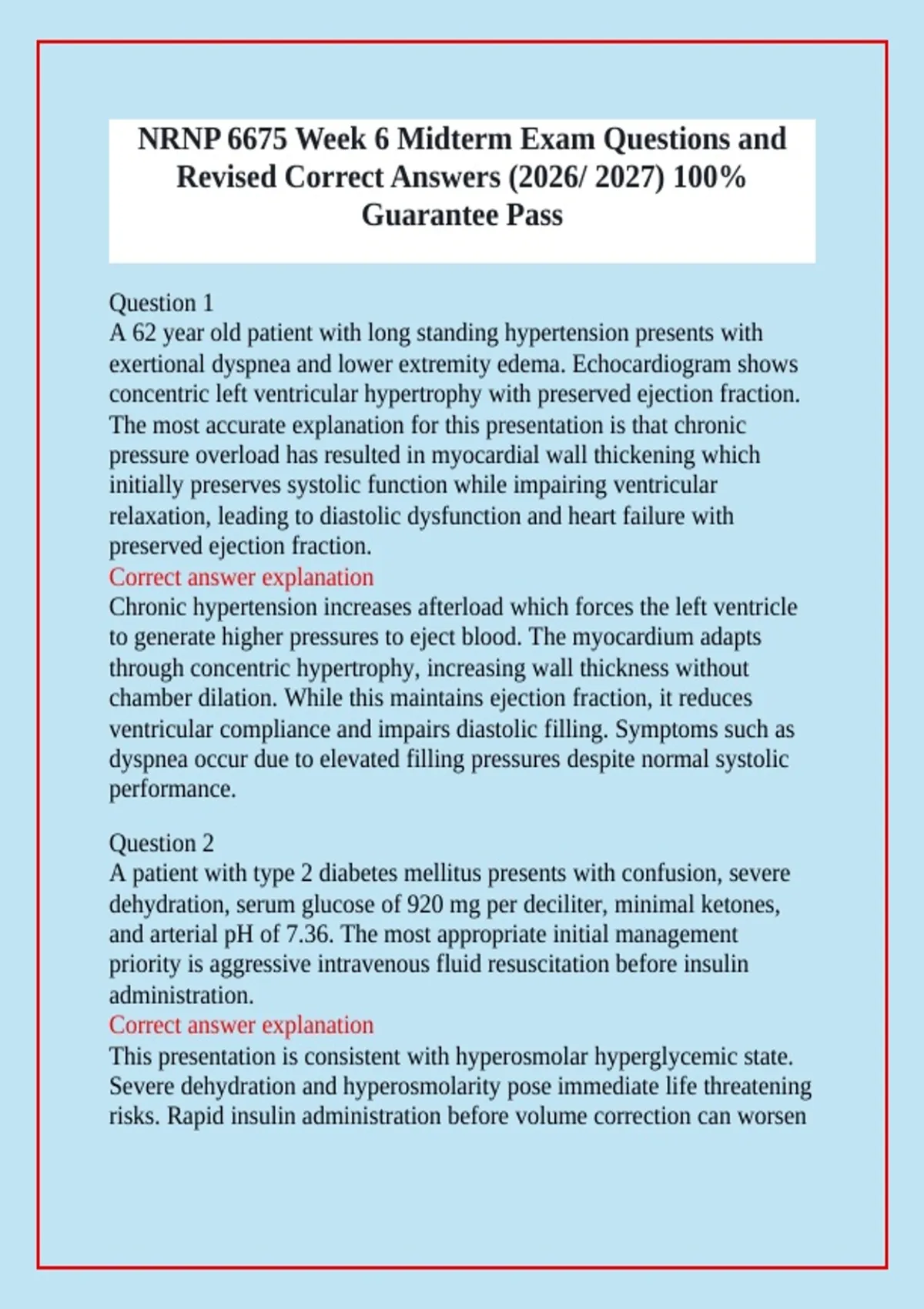 Prepare for NRNP 6675 Week 6 Midterm with 100% confidence using our comprehensive, high-fidelity practice questions. This complete study resource features over 200 graduate-level questions, each with detailed rationales, clinical reasoning, and step-by-step explanations covering pathophysiology, pharmacology, patient assessment, and clinical decision-making. Designed for nurse practitioner students, this collection mirrors actual midterm exam complexity, helping you master concepts, prioritize interventions, and excel in exams. Perfect for NRNP exam prep, graduate nursing students, and advanced practice review.