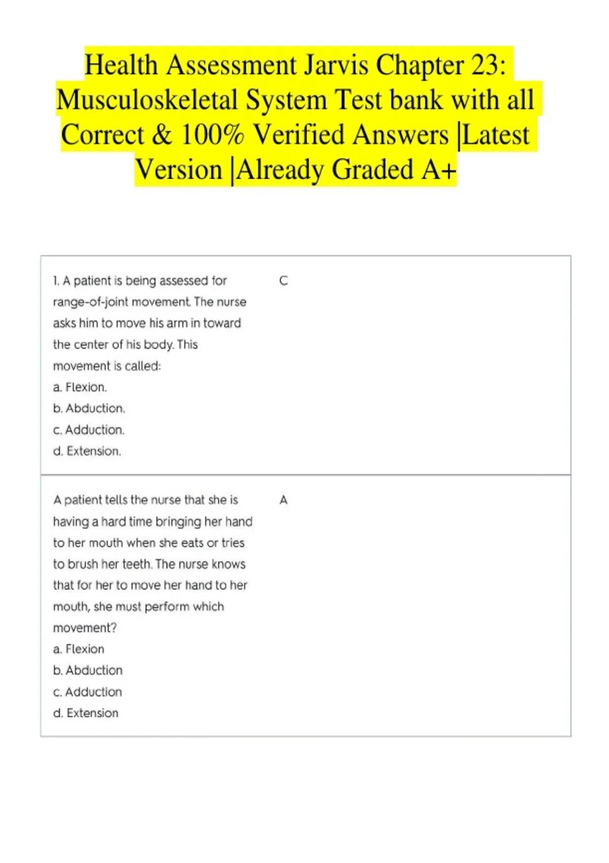 Health Assessment Jarvis Chapter 23: Musculoskeletal System Test bank with all Correct & 100% Verified Answers |Latest Version |Already Graded A+