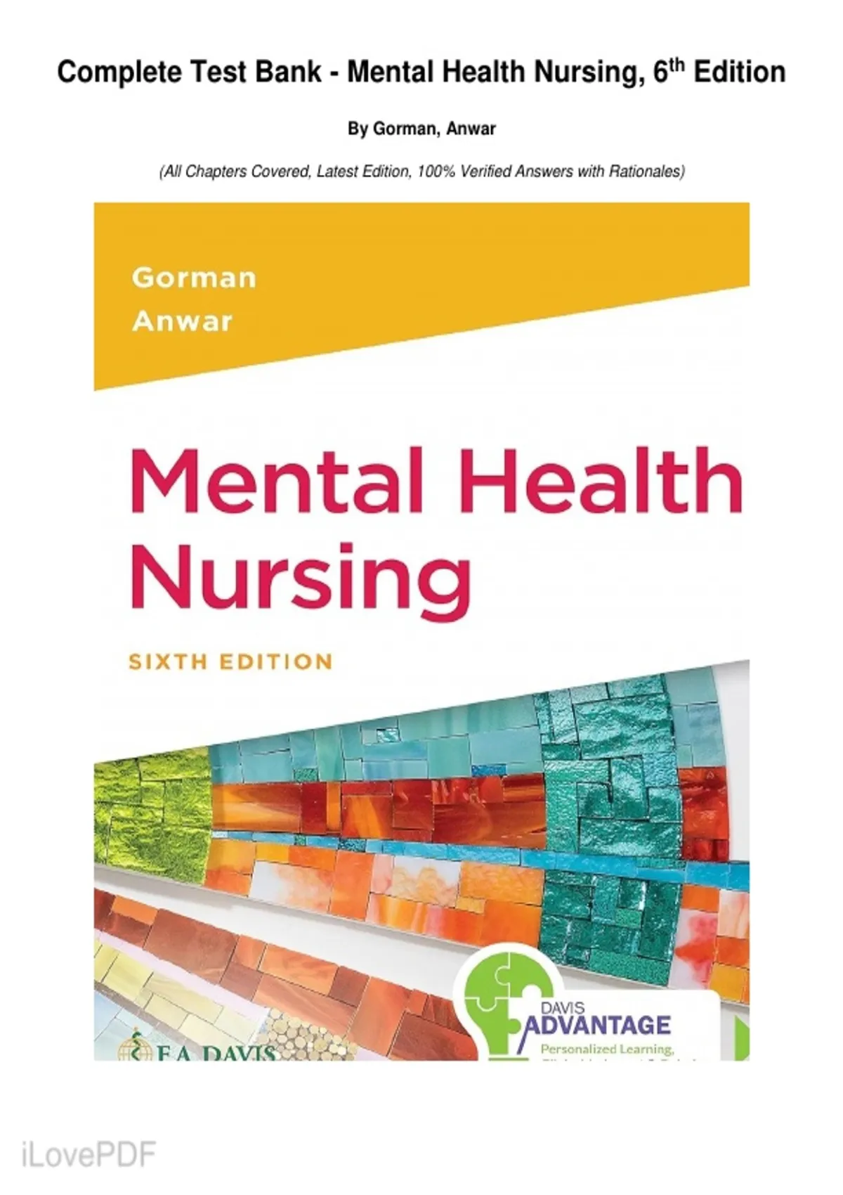 Complete Test Bank - Mental Health Nursing, 6th Edition. By Gorman, Anwar. (All Chapters Covered, Latest Edition, 100% Verified Answers with Rationales)