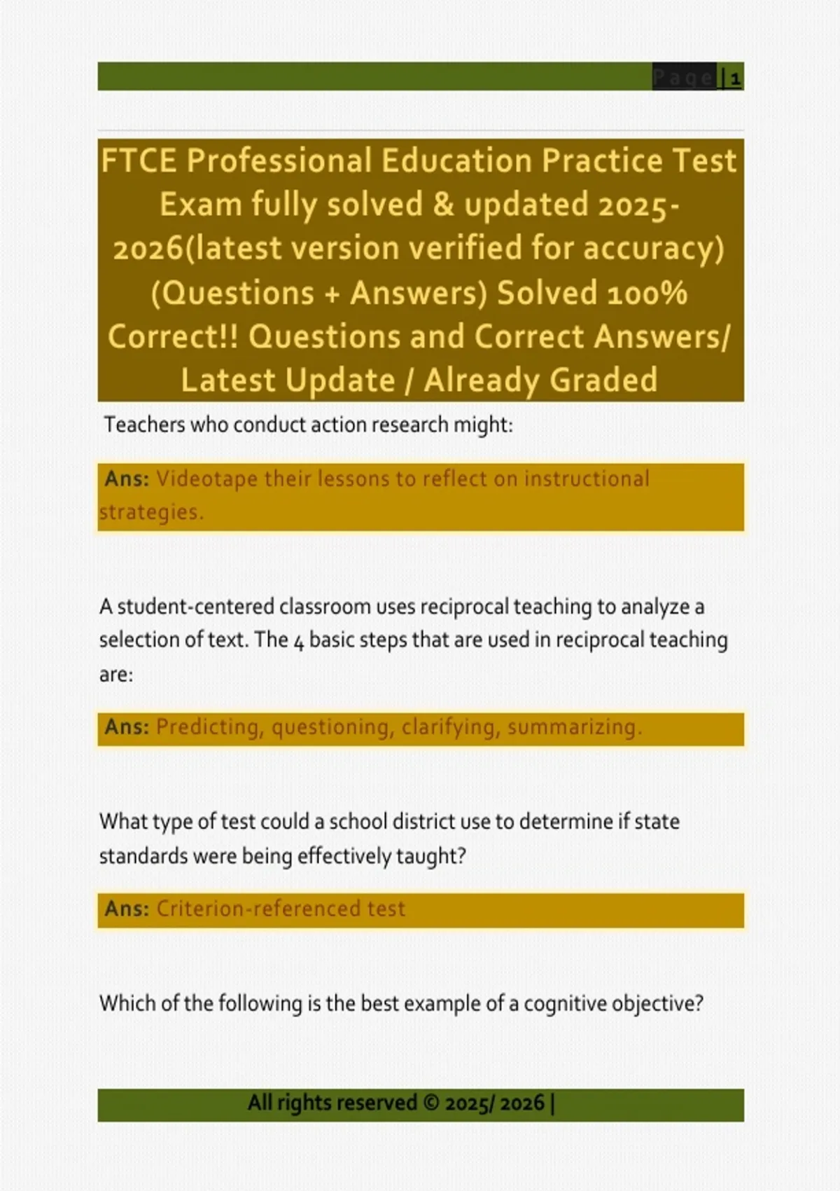 This document contains a fully solved FTCE Professional Education practice test with verified correct answers updated for the 2025–2026 exam cycle. It covers instructional strategies, classroom management, assessment methods, ESOL principles, ethics, professional responsibilities, learning theories, and Florida-specific education standards tested on the FTCE Professional Education exam.