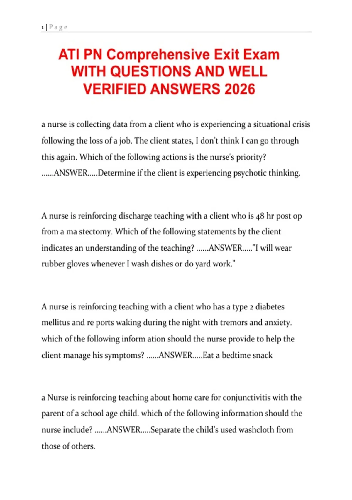 Description: Prepare for your ATI PN Comprehensive Exit Exam with this complete 2026 study guide, featuring a wide range of questions and well-verified answers aligned with the latest NCLEX-PN test plan. This resource covers essential nursing topics, including medical-surgical care, maternal-newborn health, pediatrics, mental health, pharmacology, delegation, and nursing fundamentals. Each question includes clear rationales to help reinforce clinical reasoning and exam readiness. Ideal for practical nursing students preparing for final exams, ATI exit testing, and NCLEX-PN review.