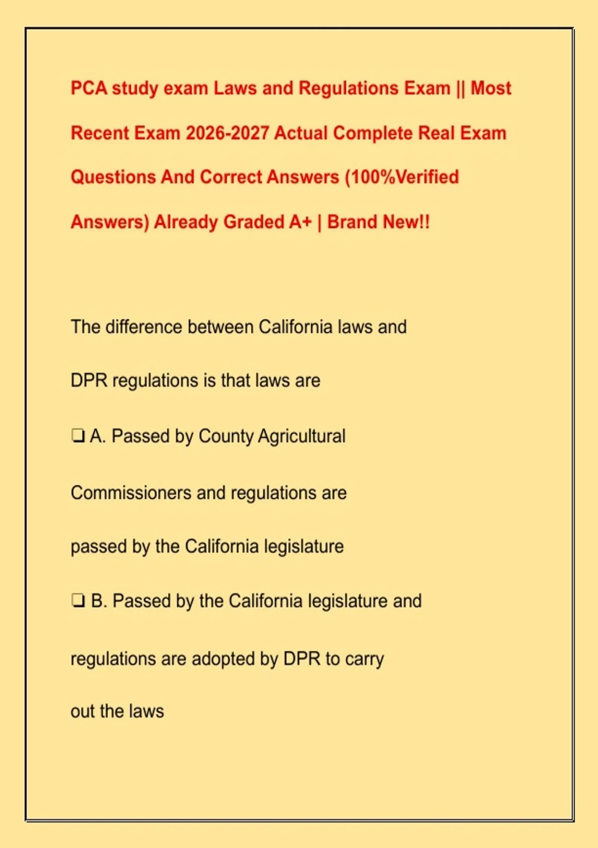 PCA study exam Laws and Regulations Exam || Most Recent Exam Actual Complete Real Exam Questions And Correct Answers (100%Verified Answers) Already Graded A+ | Brand New!!