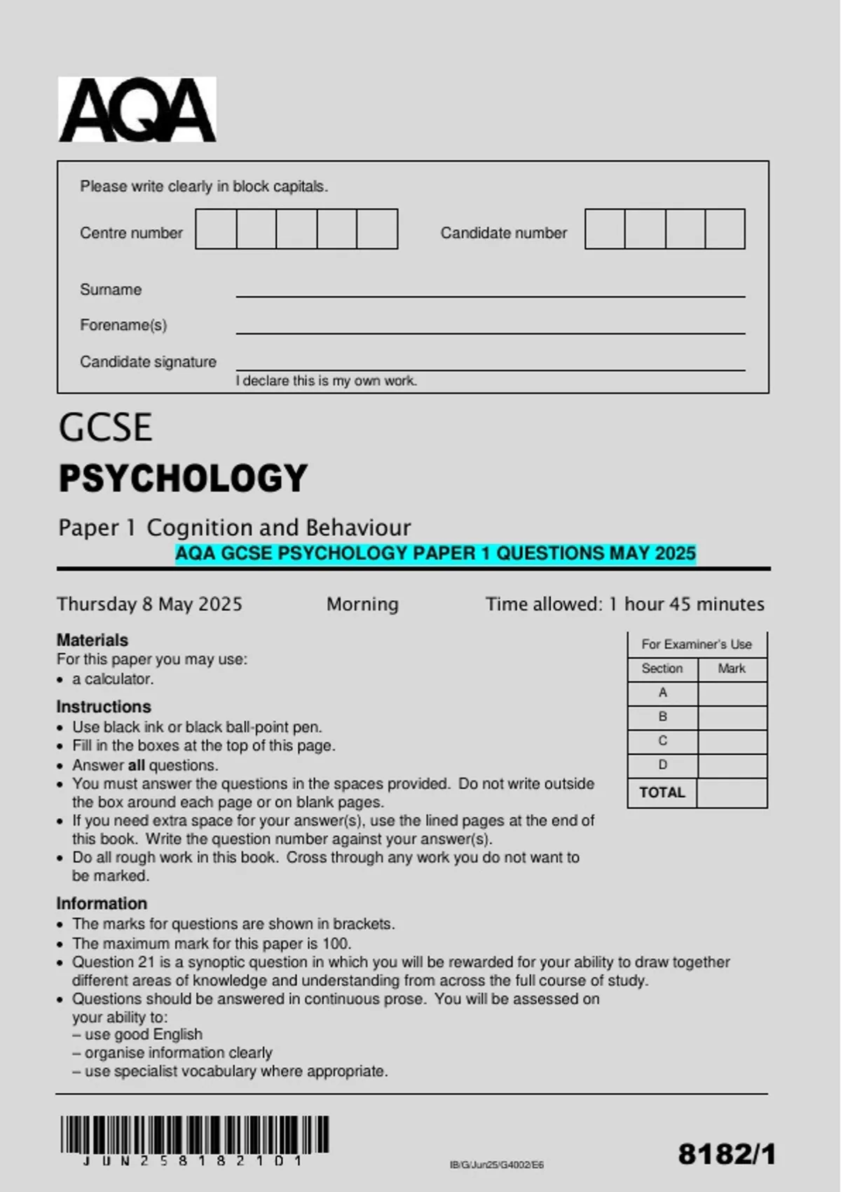 AQA GCSE PSYCHOLOGY PAPER 1 QUESTIONS MAY 2025