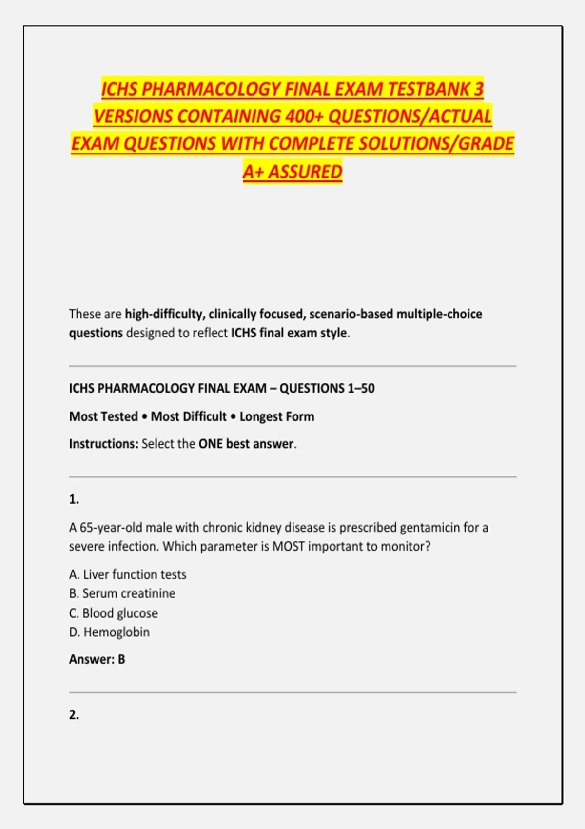 ICHS PHARMACOLOGY FINAL EXAM TESTBANK 3 VERSIONS CONTAINING 400+ QUESTIONS/ACTUAL EXAM QUESTIONS WITH COMPLETE SOLUTIONS/GRADE A+ ASSURED