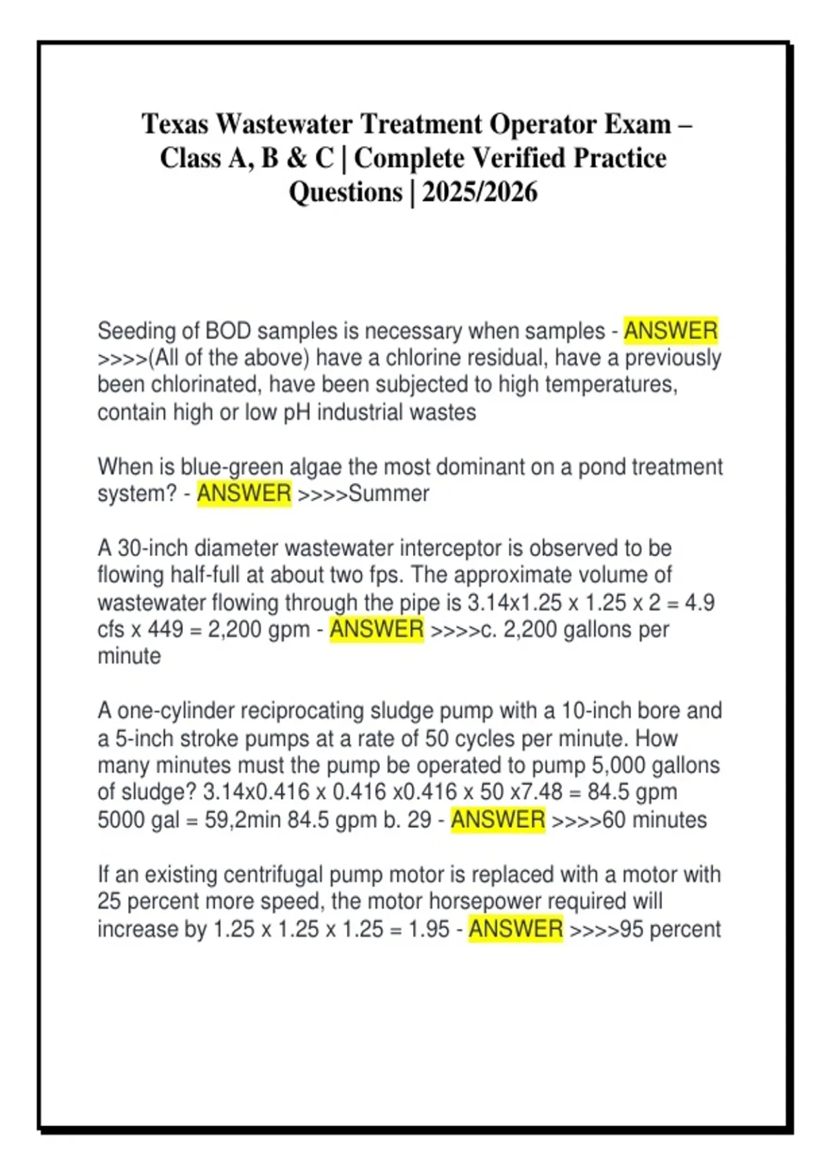 Texas Wastewater Treatment Operator Exam – Class A, B & C | Complete Verified Practice Questions | 2025/2026