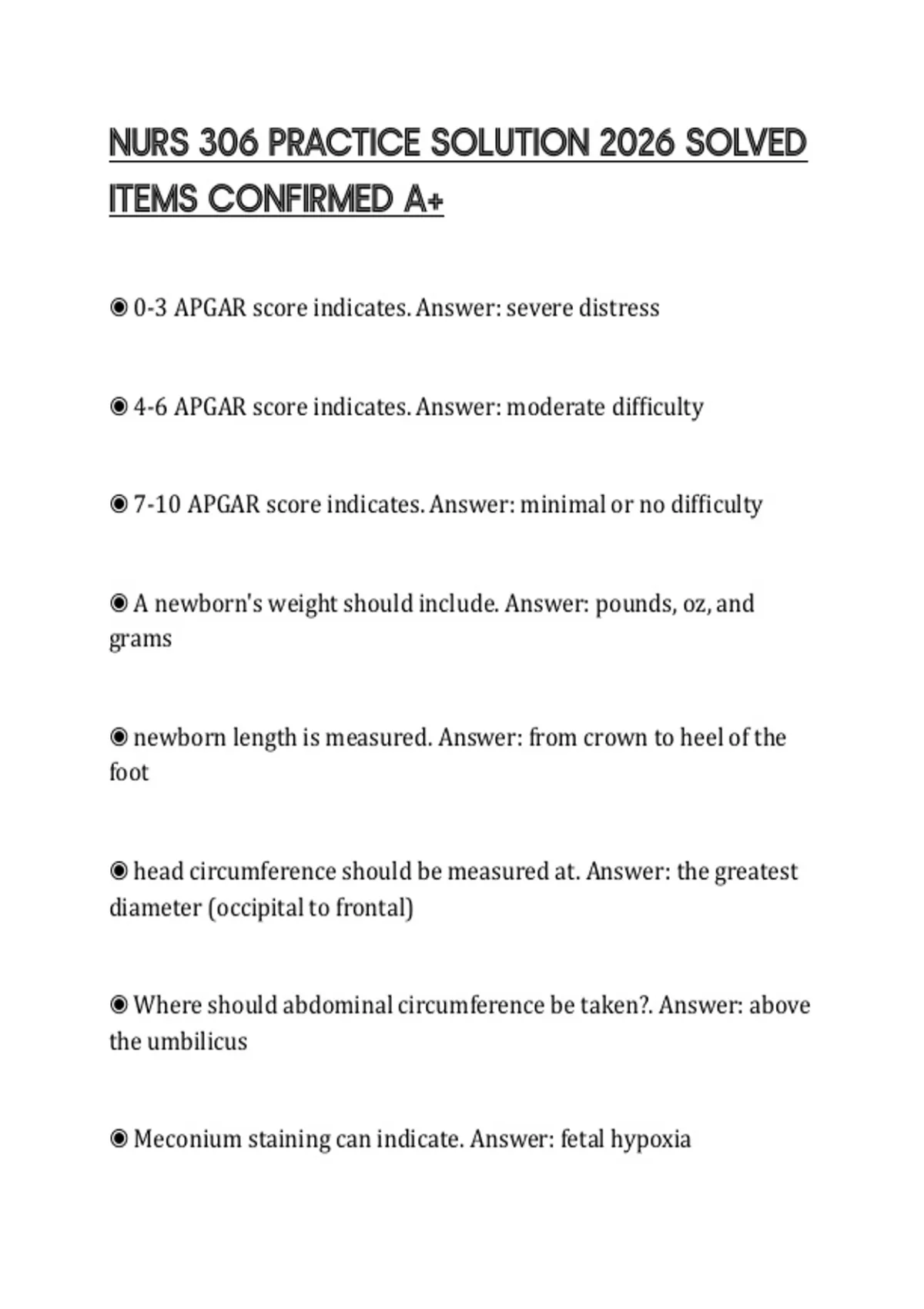 NURS 306 PRACTICE SOLUTION 2026 SOLVED ITEMS CONFIRMED A+