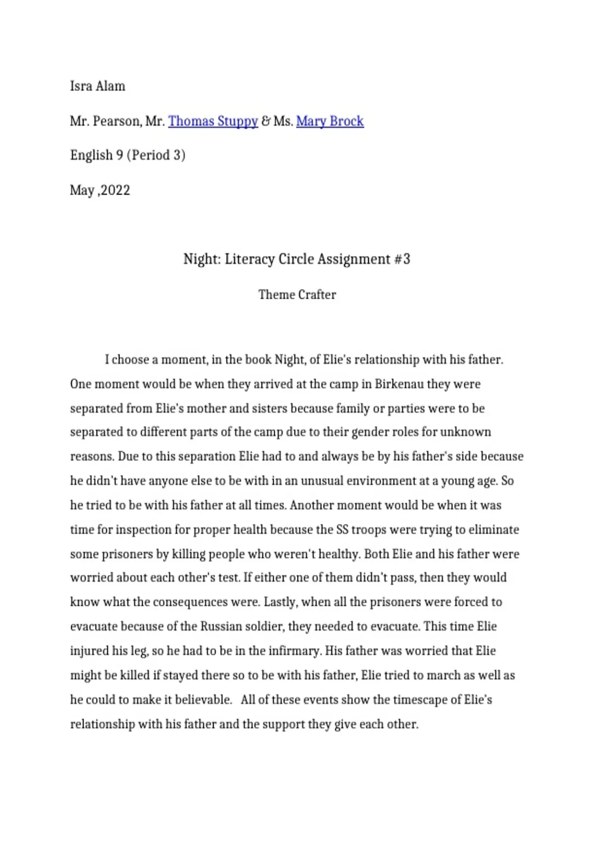 I choose a moment, in the book Night, of Elie's relationship with his father.