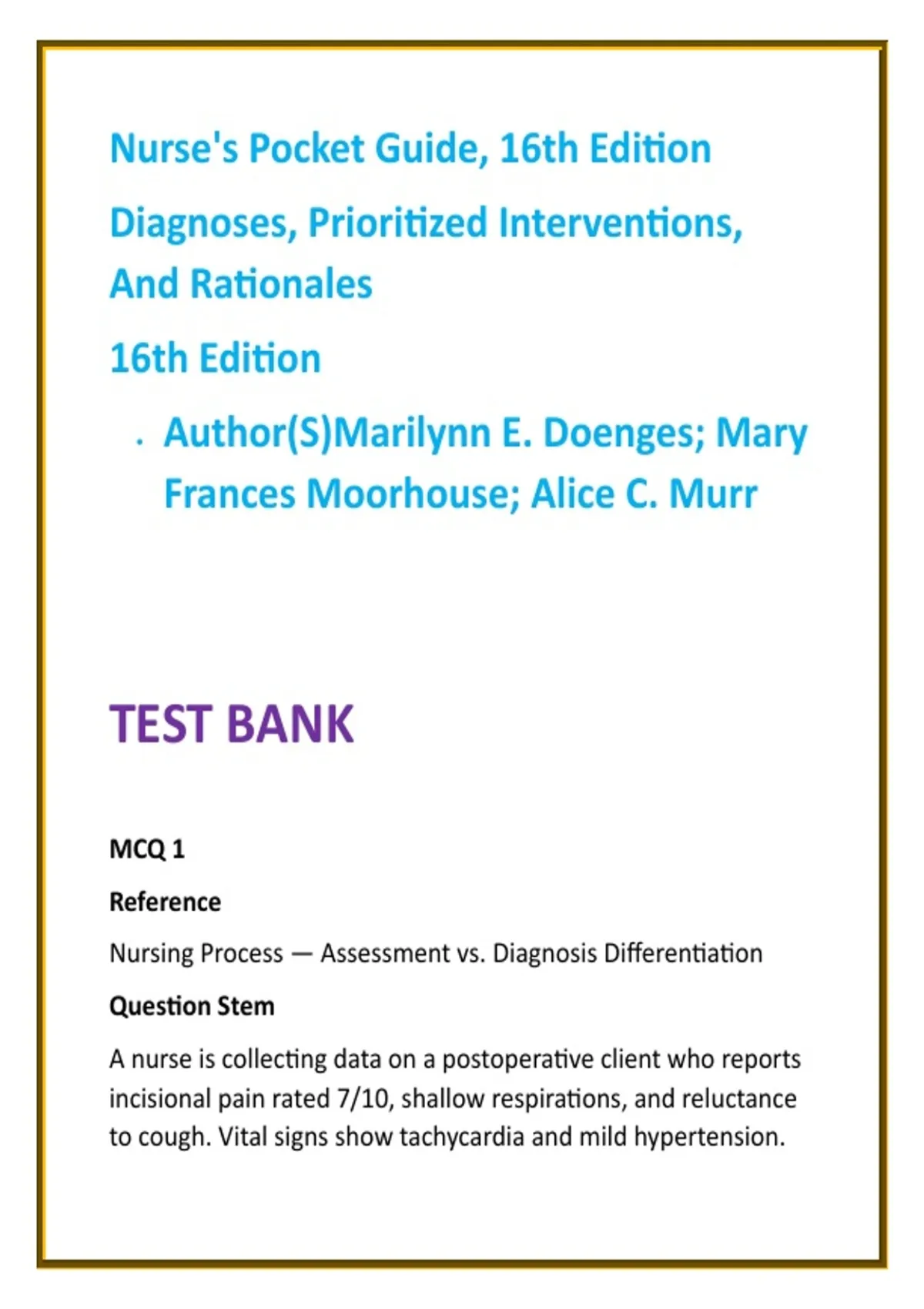 Nurse’s Pocket Guide 16th Edition Nursing Test Bank 2026 | Nursing Diagnoses, Care Plans & NCLEX-Style Questions Description: This comprehensive Nurse’s Pocket Guide 16th Edition Nursing Test Bank (2026) is a high-quality digital study aid designed to support nursing students in mastering nursing diagnoses, prioritized interventions, and care-plan development across the entire curriculum. Developed to align strictly with Nurse’s Pocket Guide: Diagnoses, Prioritized Interventions, and Rationales by Doenges, Moorhouse, and Murr, this resource provides full textbook coverage with 25 NCLEX-style MCQs per chapter. Each question is written at the application and clinical judgment level, mirroring the reasoning expected in ADN and BSN programs. Rationales clearly explain why an answer is correct, reinforce diagnostic accuracy, and highlight priority nursing actions grounded in safety and evidence-based care. This test bank is ideal for reinforcing the nursing process—from assessment and diagnosis to planning, intervention, and evaluation. Designed as an ethical academic study aid, this product does not contain official, faculty, or leaked exam questions. Instead, it helps learners strengthen exam readiness, improve clinical prioritization, and build confidence in care planning for real-world practice and NCLEX-style testing. Key Features: Full coverage of all chapters in Nurse’s Pocket Guide, 16th Edition 25 NCLEX-style multiple-choice questions per chapter Clear, evidence-based rationales for every answer Strong focus on nursing diagnoses, priorities, and safety Ideal for Fundamentals, Med-Surg, Mental Health, Maternal–Child, and Community Nursing Instant digital access for efficient, time-saving study Trusted by nursing educators worldwide, this test bank supports concept mastery, score improvement, and clinical reasoning development. Keywords: Nurse’s Pocket Guide 16th Edition test bank nursing diagnoses practice questions nursing care plans MCQs NCLEX-style nursing questions 2026 nursing process test bank prioritized nursing interventions questions Doenges nursing diagnosis test bank nursing clinical reasoning MCQs Hashtags: #NursesPocketGuide #NursingTestBank #NursingDiagnoses #CarePlanPractice #NCLEXStyleQuestions #NursingStudents #ClinicalReasoning #MedSurgNursing #FundamentalsOfNursing #NursingEducation