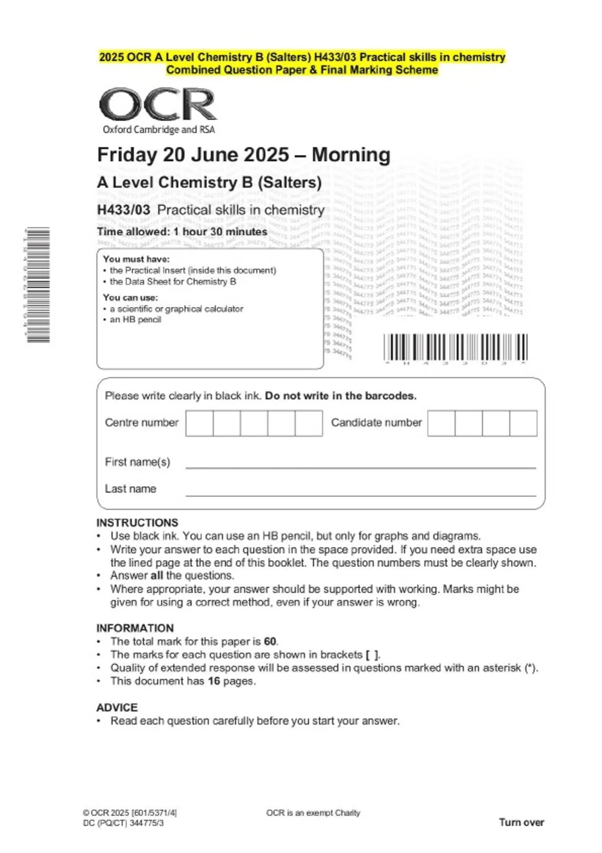 This document contains a comprehensive, combined, and integrated chemistry practical skills question paper with a complete final marking scheme. It is clearly structured for practical exam revision, assessment preparation, and academic reference. Suitable for students and educators seeking reliable and knowledgeable chemistry practical practice material.