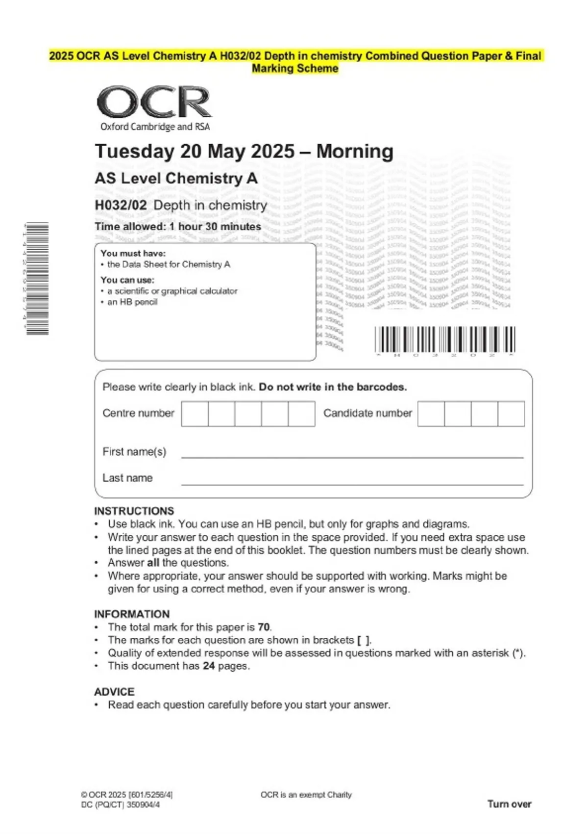 This document contains a comprehensive, combined, and integrated chemistry question paper with a complete final marking scheme, designed to assess in-depth understanding of key chemistry concepts. It is well structured and suitable for revision, exam preparation, continuous assessment tests, and academic reference. Ideal for students and educators seeking reliable practice material that supports deeper learning in chemistry.