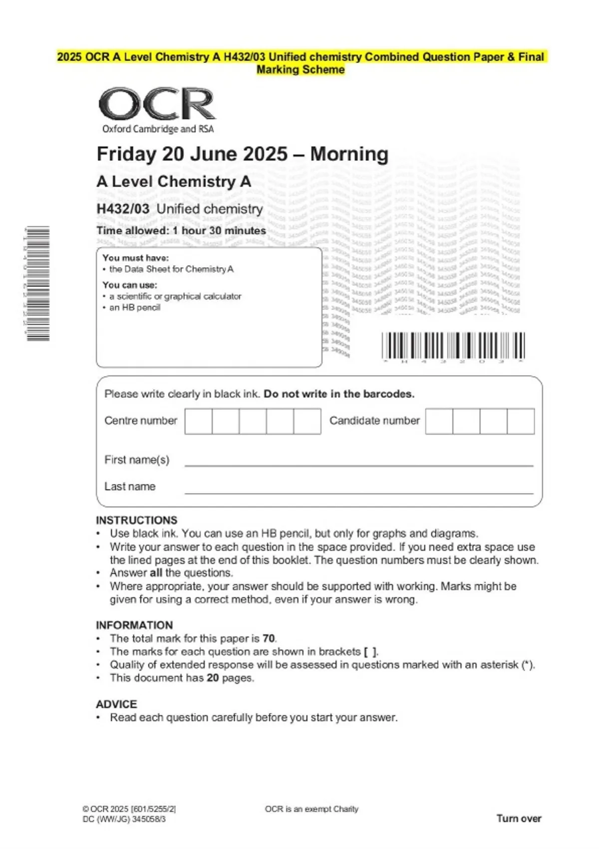 This document contains a comprehensive, combined, and integrated chemistry question paper with a complete final marking scheme, focusing on Unified Chemistry. It is well structured and suitable for revision, exam preparation, continuous assessment tests, and academic reference. Ideal for students and educators seeking reliable practice material.