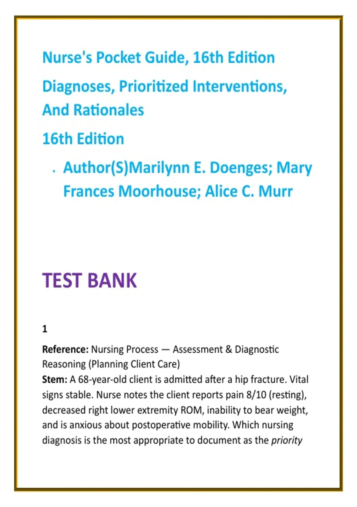 Nurse’s Pocket Guide 16th Edition Nursing Test Bank 2026 | Nursing Diagnoses & Care Plans | NCLEX-Style Questions Description: Master nursing diagnoses, prioritized interventions, and safe clinical decision-making with this comprehensive nursing test bank developed exclusively from Nurse’s Pocket Guide: Diagnoses, Prioritized Interventions, and Rationales (16th Edition) by Doenges, Moorhouse, and Murr. Designed for 2026 nursing exams, this digital study aid delivers full textbook coverage with 25 NCLEX-style MCQs per chapter, each supported by clear, evidence-based rationales grounded in the Pocket Guide. This resource is ideal for Fundamentals of Nursing, Nursing Diagnosis & Care Planning, Adult Health/Medical-Surgical, Mental Health, Maternal–Child, and Community Health courses that rely on the Nurse’s Pocket Guide. Questions emphasize diagnostic accuracy, priority setting (ABCs, safety, acute vs. chronic), and clinical judgment, helping students translate textbook concepts into exam-ready reasoning. Built for efficiency and confidence, this test bank saves study time, reinforces care-plan logic, and sharpens clinical prioritization—without claiming access to official or faculty exams. It is a legitimate study aid created for ethical academic use and aligns with the way nursing students are tested. Key Features: Full coverage of all chapters from the Nurse’s Pocket Guide 16th Edition 25 NCLEX-style MCQs per chapter with one best answer Detailed rationales focused on nursing diagnoses, interventions, and outcomes Strong emphasis on patient safety, prioritization, and care-plan development Digital format for fast review, targeted practice, and score improvement Keywords: Nurse’s Pocket Guide 16th Edition test bank nursing diagnoses practice questions nursing care plans MCQs NCLEX-style nursing questions nursing process test bank prioritized nursing interventions care planning nursing exams nursing diagnosis study guide Hashtags: #NursesPocketGuide #NursingTestBank #NursingDiagnoses #CarePlans #NCLEXStyleQuestions #NursingProcess #ClinicalJudgment #NursingStudents #MedSurgNursing #NursingEducation