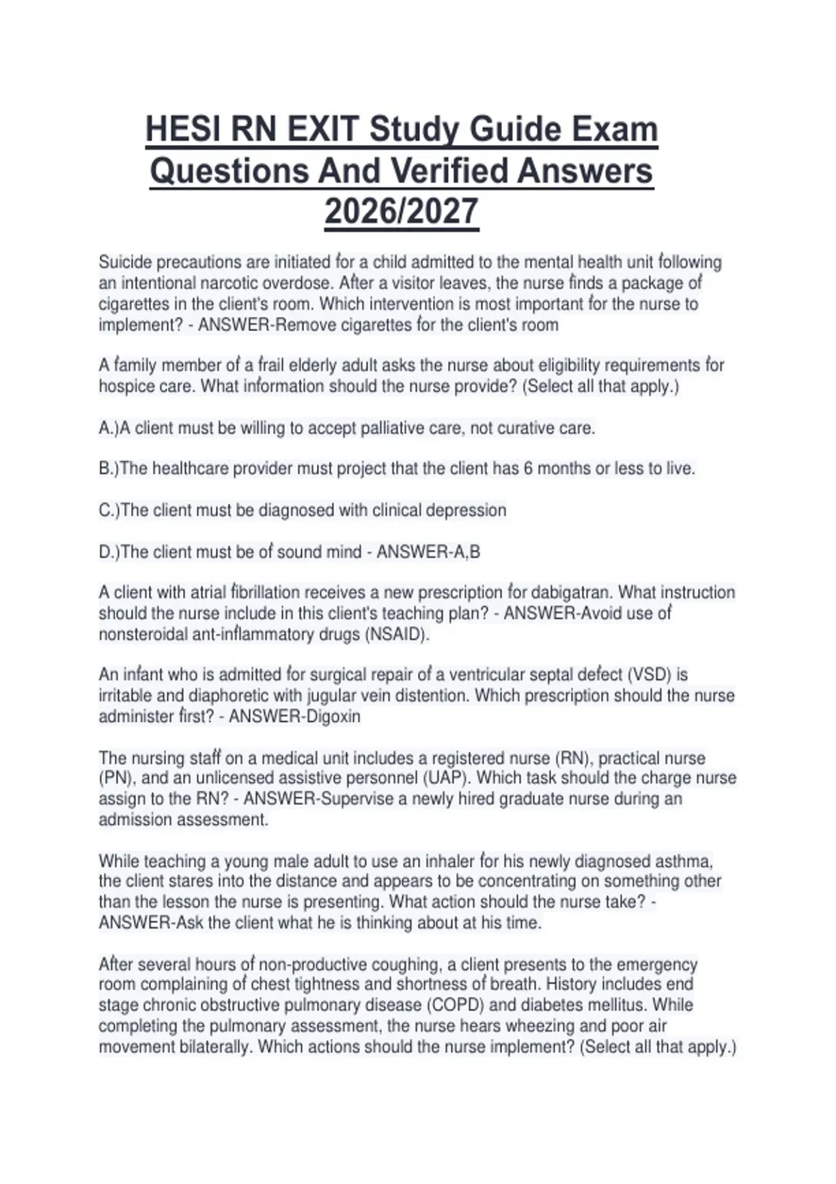 HESI RN EXIT Study Guide Exam Questions And Verified Answers 2026/2027