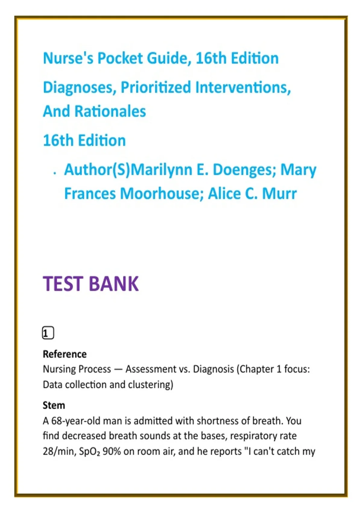 Nurse’s Pocket Guide 16th Edition Nursing Test Bank 2026 | Nursing Diagnoses, Care Plans, NCLEX-Style Questions Description: Master nursing diagnoses, care planning, and clinical prioritization with this comprehensive Nurse’s Pocket Guide 16th Edition nursing test bank (2026 edition). Designed as a high-impact study aid, this digital resource supports nursing students in developing the clinical judgment skills required for exams and real-world patient care. Built around the trusted framework of Doenges, Moorhouse, & Murr, this test bank reinforces the nursing process from assessment through evaluation. Each chapter includes 25 NCLEX-style multiple-choice questions that emphasize diagnostic accuracy, prioritized interventions, and safe, evidence-based nursing actions. Rationales go beyond simple answers to strengthen understanding of why specific nursing decisions are correct. Ideal for students in Fundamentals, Adult Health, Mental Health, Maternal–Child, and Community Nursing, this resource helps translate textbook knowledge into exam-ready clinical reasoning. What’s Included: Full textbook coverage — all chapters 25 NCLEX-style MCQs per chapter Clear, evidence-based rationales for every answer Strong focus on nursing diagnoses and care-plan development Prioritization practice using safety and clinical judgment principles Digital format for fast, flexible studying This is a supplemental study tool created to reinforce learning — not official exam content. Use it to save study time, strengthen weak areas, and build confidence in nursing diagnosis and care planning. Keywords: nursing diagnosis test bank care plan practice questions NCLEX style nursing questions nursing process exam prep nursing care planning study guide clinical judgment nursing questions prioritization nursing exam practice fundamentals of nursing test bank Hashtags: #NursingTestBank #NursingDiagnoses #CarePlanStudy #NCLEXPrep #NursingStudentLife #FundamentalsOfNursing #MedSurgNursing #NursingSchoolSuccess #ClinicalJudgment #NursingExamPrep