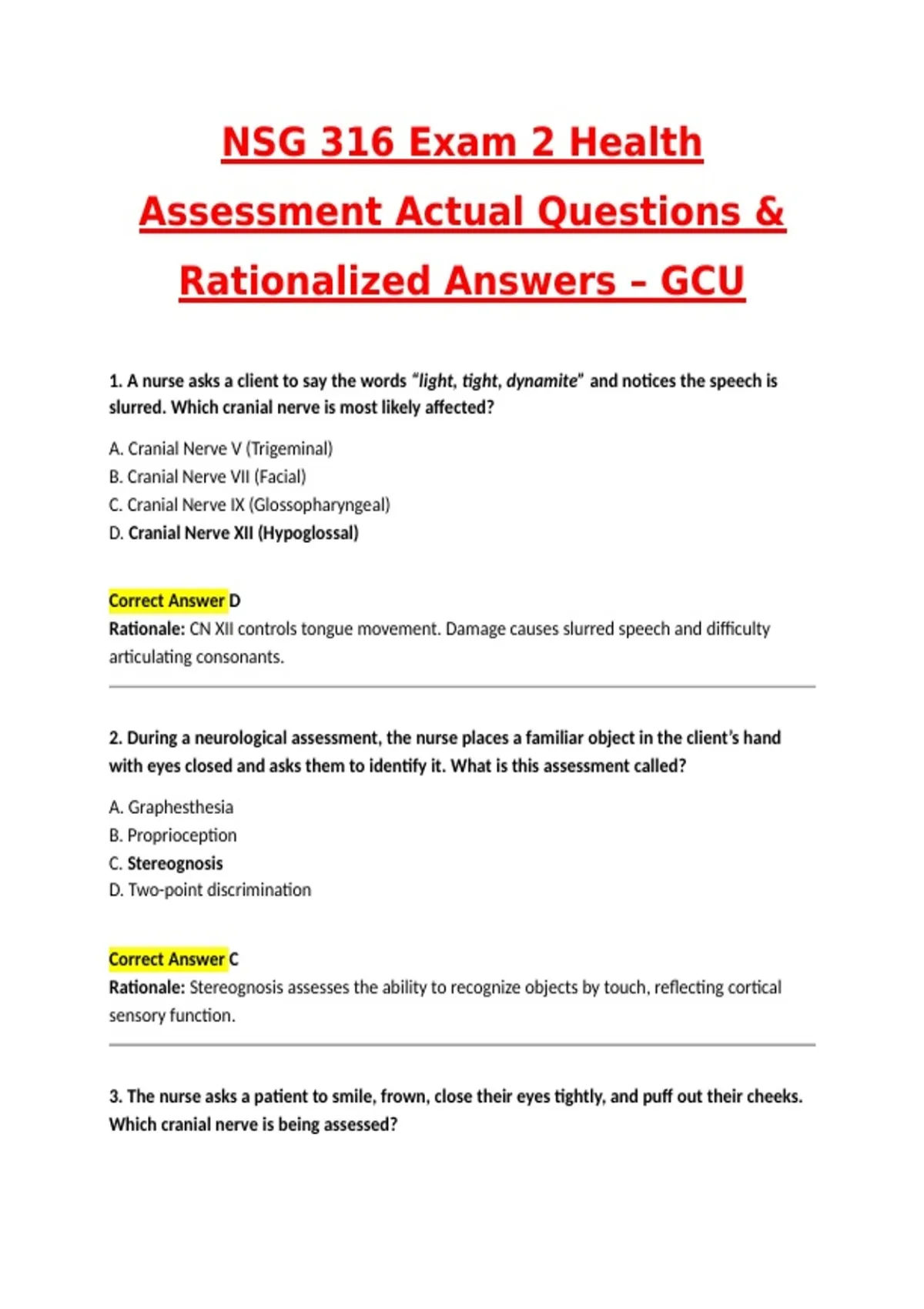 NSG 316 Exam 2 – Health Assessment (Latest 2026 / 2027) – Actual Questions & Rationalized Answers – GCU INSTANT DOWNLOAD PDF – NSG 316 Exam 2 Health Assessment guide from Grand Canyon University (GCU) includes updated and verified questions with full rationalized answers based on the 2025 / 2026 curriculum. Covers advanced health assessment topics including neurological, cardiovascular, respiratory, musculoskeletal, and abdominal systems. Ideal for GCU nursing students preparing for Exam 2 with confidence. NSG 316 Exam 2 GCU, health assessment exam GCU, Grand Canyon University nursing, NSG316 rationalized answers, nursing assessment exam 2025, GCU exam 2 study guide, cardiovascular assessment questions, neurological system nursing quiz, NSG 316 verified questions, respiratory assessment practice, abdominal assessment GCU, musculoskeletal system nursing, NSG 316 test bank PDF, GCU nursing school prep, advanced health assessment exam, physical assessment nursing GCU, NSG316 multiple choice questions, Grand Canyon nursing test, health assessment rationales, NSG 316 clinical exam help