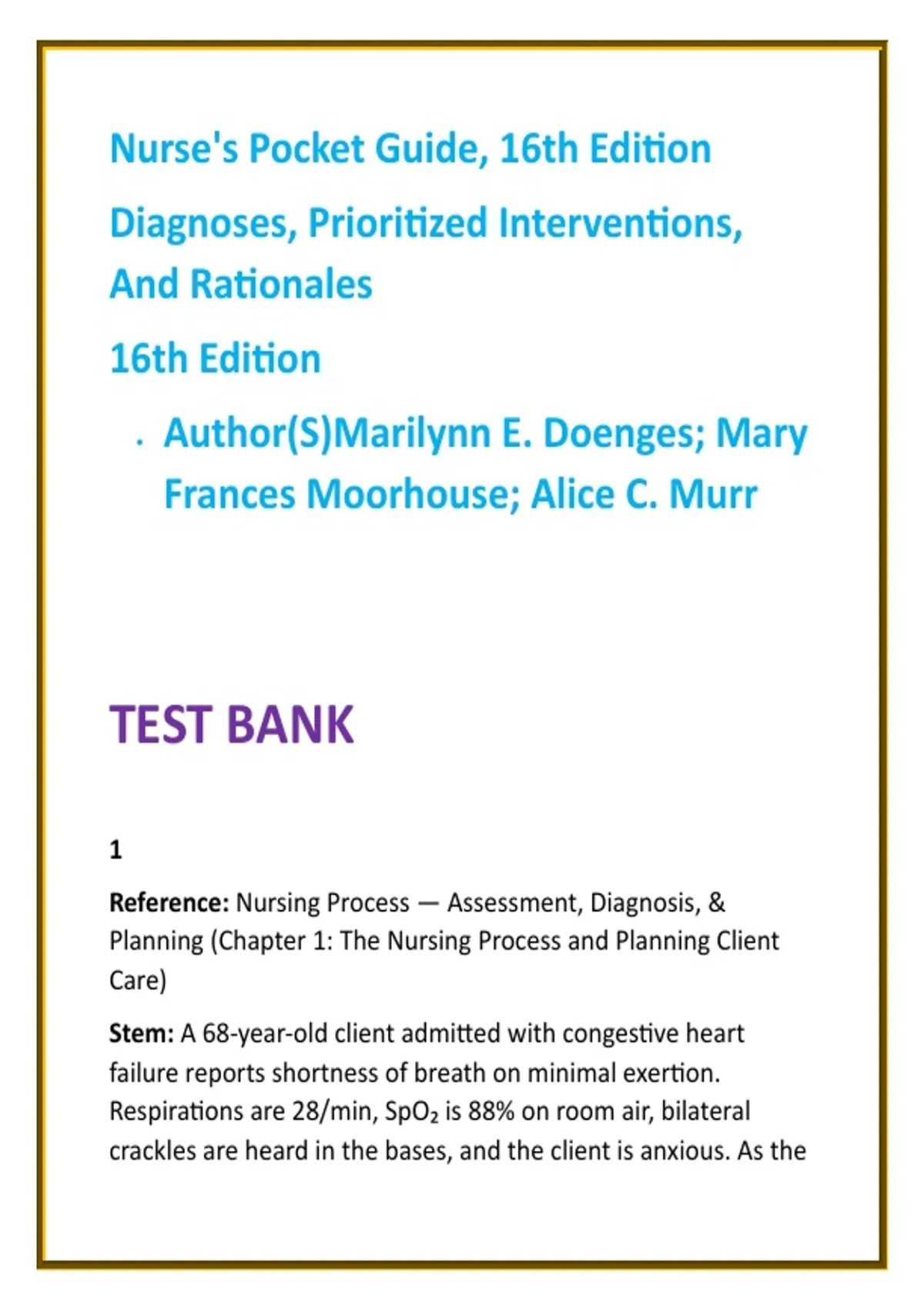 Nurse’s Pocket Guide 16th Edition Nursing Test Bank 2026 | Nursing Diagnoses, Care Plans & NCLEX-Style Questions Description: Master nursing diagnoses and care-plan clinical judgment with this comprehensive Nurse’s Pocket Guide 16th Edition Nursing Test Bank (2026). Designed specifically for undergraduate and pre-licensure nursing students, this digital study resource provides full textbook coverage of all chapters from Nurse’s Pocket Guide: Diagnoses, Prioritized Interventions, and Rationales by Doenges, Moorhouse, and Murr—a gold-standard reference in nursing education. Each chapter includes 25 NCLEX-style multiple-choice questions that require application, analysis, and prioritization rather than memorization. Questions are carefully aligned with nursing curricula in Fundamentals, Nursing Diagnosis & Care Planning, Med-Surg, Mental Health, Maternal–Child, and Community Health courses. Detailed rationales reinforce diagnostic accuracy, safety principles, and evidence-based nursing interventions, helping students understand why an answer is correct. This test bank is an ethical study aid—not official exams or faculty materials—created to support exam preparation, concept reinforcement, and confidence in clinical reasoning. The digital format allows for efficient, flexible study, making it ideal for busy nursing students and educators seeking reliable supplemental practice. Key Features: Full coverage of Nurse’s Pocket Guide, 16th Edition (all chapters) 25 NCLEX-style MCQs per chapter Clear, nursing-focused rationales grounded in the textbook Strong emphasis on nursing diagnoses, prioritized interventions, and care plans Supports exam readiness, clinical judgment, and patient safety Digital, time-saving, and easy to use for focused review Built on the trusted framework of Doenges, Moorhouse, & Murr, this nursing test bank helps transform care-plan theory into exam-ready clinical reasoning. Keywords: Nurse’s Pocket Guide 16th Edition test bank nursing diagnoses practice questions nursing care plans MCQs NCLEX-style nursing test bank nursing process and care planning questions Doenges nursing diagnoses test bank clinical judgment nursing questions nursing prioritization practice Hashtags: #NursingTestBank #NursingDiagnoses #CarePlanPractice #NCLEXStyleQuestions #NursingStudents #FundamentalsOfNursing #MedSurgNursing #NursingEducation #ClinicalJudgment #NurseLife