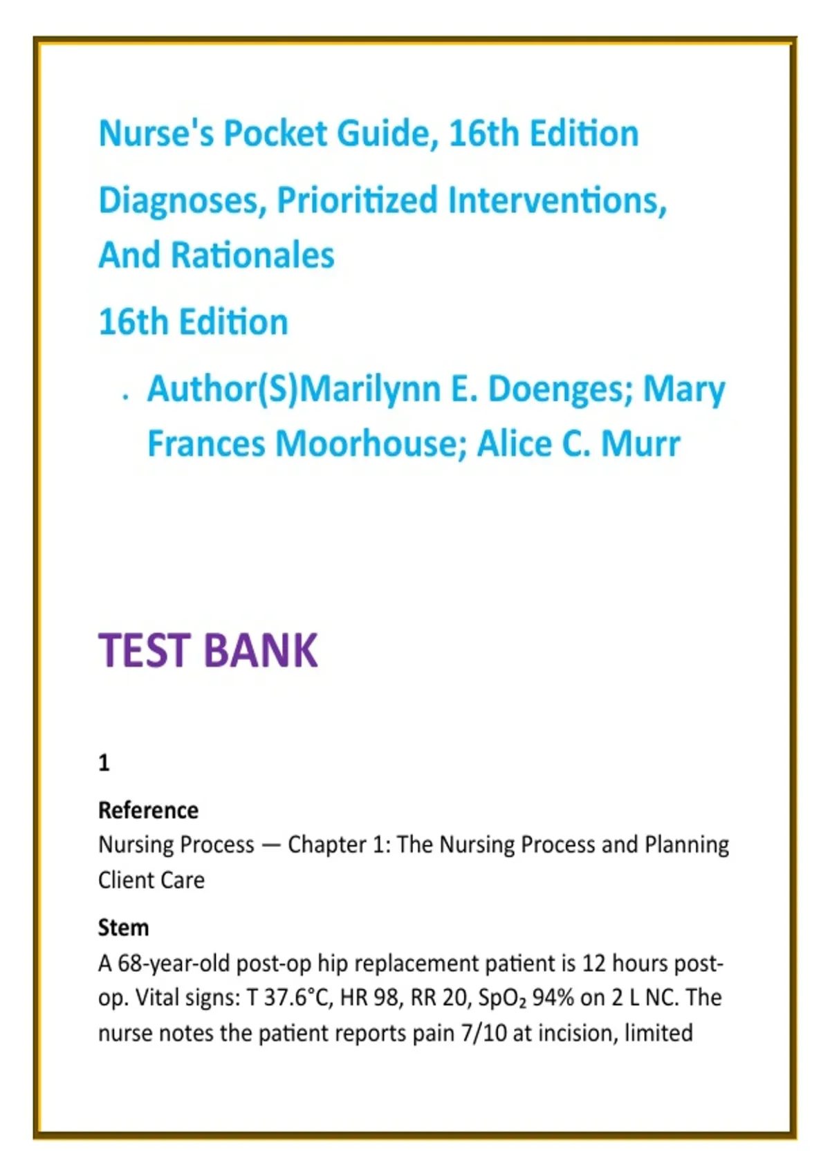 Nurse’s Pocket Guide 16th Edition Nursing Test Bank 2026 | Nursing Diagnoses, Care Plans & NCLEX-Style Questions Description: Master nursing diagnoses and care planning with confidence using this Nurse’s Pocket Guide 16th Edition Nursing Test Bank (2026) — a comprehensive, exam-focused study resource built strictly from Nurse’s Pocket Guide: Diagnoses, Prioritized Interventions, and Rationales by Doenges, Moorhouse, and Murr. This digital test bank provides full textbook coverage, with 25 NCLEX-style multiple-choice questions per chapter, carefully designed to reinforce clinical reasoning, priority setting, and patient safety. Every question is aligned with undergraduate and pre-licensure nursing curricula and reflects the way nursing diagnoses and care plans are tested in real exams. Questions emphasize accurate NANDA-I nursing diagnosis selection, identification of priority interventions, and evaluation of patient-centered outcomes, helping students move beyond memorization to true nursing judgment. Each MCQ includes a clear, evidence-based rationale grounded in the textbook, supporting concept mastery and long-term retention. This resource is ideal for students in Fundamentals of Nursing, Nursing Diagnosis & Care Planning, Med-Surg, Mental Health, Maternal–Child, and Community Health Nursing. It is designed strictly as a study aid for exam preparation and clinical understanding — not official or faculty exam content. Key Features: Full coverage of Nurse’s Pocket Guide (16th Edition) 25 NCLEX-style MCQs per chapter Detailed rationales tied to nursing diagnoses and interventions Strong focus on care plans, prioritization, and safety Digital format for fast review, repetition, and score improvement Trusted by nursing students worldwide, this test bank helps you study smarter, strengthen care-plan logic, and walk into exams prepared. Keywords: Nurse’s Pocket Guide test bank nursing diagnoses practice questions nursing care plan MCQs NCLEX nursing diagnosis questions nursing prioritization test bank care planning nursing exam prep Doenges nursing diagnoses test bank nursing fundamentals test bank Hashtags: #NursingTestBank #NursingDiagnoses #CarePlans #NCLEXStyleQuestions #NursingStudents #NursingFundamentals #CarePlanPractice #NursingEducation #MedSurgNursing #NCLEXPrep