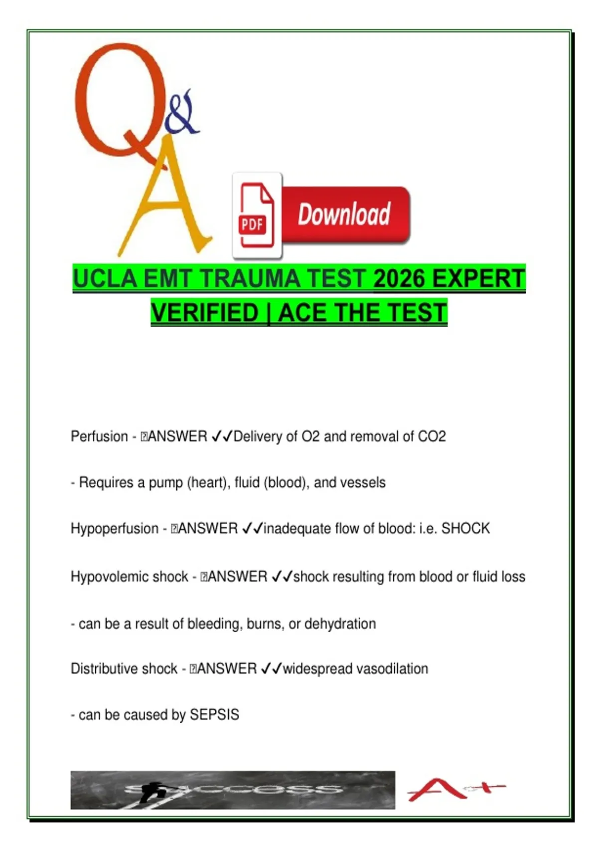 This document includes 100 expert-verified trauma test questions and answers specifically designed for EMT 120 at the University of California, Los Angeles (UCLA), tailored for the 2026 academic cycle. It serves as a comprehensive and focused trauma-specific review resource for EMT students, covering both foundational and advanced emergency care protocols related to traumatic injuries. Major topics include: Shock management: including hypovolemic, cardiogenic, obstructive, neurogenic, and anaphylactic shock, as well as compensatory and decompensated states. Neurological trauma: detailed mechanisms and symptoms of TBIs (e.g., concussions, cerebral contusions, epidural and subdural hematomas, herniation syndrome, and spinal cord injuries). Chest trauma: such as rib fractures, flail chest, pneumothorax (open, closed, tension), hemothorax, cardiac tamponade, myocardial contusion, and commotio cordis. Environmental and abdominal trauma: including cold and heat injuries, abdominal evisceration, drowning, blast injuries, and envenomations. This material is particularly suited for: Students in EMT training programs focused on trauma response Paramedic and prehospital care trainees preparing for trauma certifications Nursing or physician assistant students in emergency or trauma modules Candidates preparing for NREMT or trauma-focused practical assessments Each entry is structured with concise definitions, symptoms, and field-appropriate treatments, making it ideal for rapid study, scenario simulation, or final exam prep. Keywords: EMT 120, trauma exam, shock types, TBI, pneumothorax, flail chest, spinal motion restriction, head injury, chest trauma, herniation syndrome, hemorrhage, cardiac tamponade, environmental emergencies, hypothermia, hyperthermia, blast injury, EMT trauma prep, UCLA