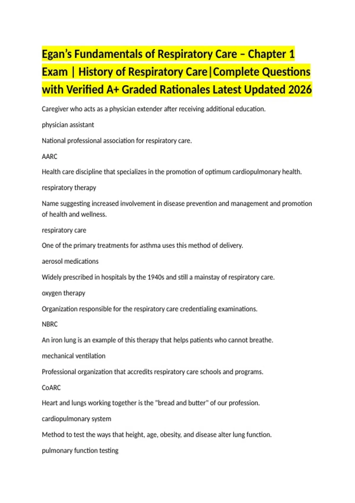 Egan’s Fundamentals of Respiratory Care – Chapter 1 Exam | History of Respiratory Care|Complete Questions with Verified A+ Graded Rationales Latest Updated 2026 Caregiver who acts as a physician extender after receiving additional education. physician assistant National professional association for respiratory care. AARC Health care discipline that specializes in the promotion of optimum cardiopulmonary health. respiratory therapy Name suggesting increased involvement in disease prevention and management and promotion of health and wellness. respiratory care One of the primary treatments for asthma uses this method of delivery. aerosol medications Widely prescribed in hospitals by the 1940s and still a mainstay of respiratory care. oxygen therapy Organization responsible for the respiratory care credentialing examinations. NBRC An iron lung is an example of this therapy that helps patients who cannot breathe. mechanical ventilation Professional organization that accredits respiratory care schools and programs. CoARC Heart and lungs working together is the "bread and butter" of our profession. cardiopulmonary system Method to test the ways that height, age, obesity, and disease alter lung function. pulmonary function testing Another name for the RT is this more formal term. respiratory care practitioner(s) Individual trained to deliver care to patients with heart and lung disease. respiratory therapist(s) Relieving obstruction is the key to this respiratory procedure. airway management Define the respirat