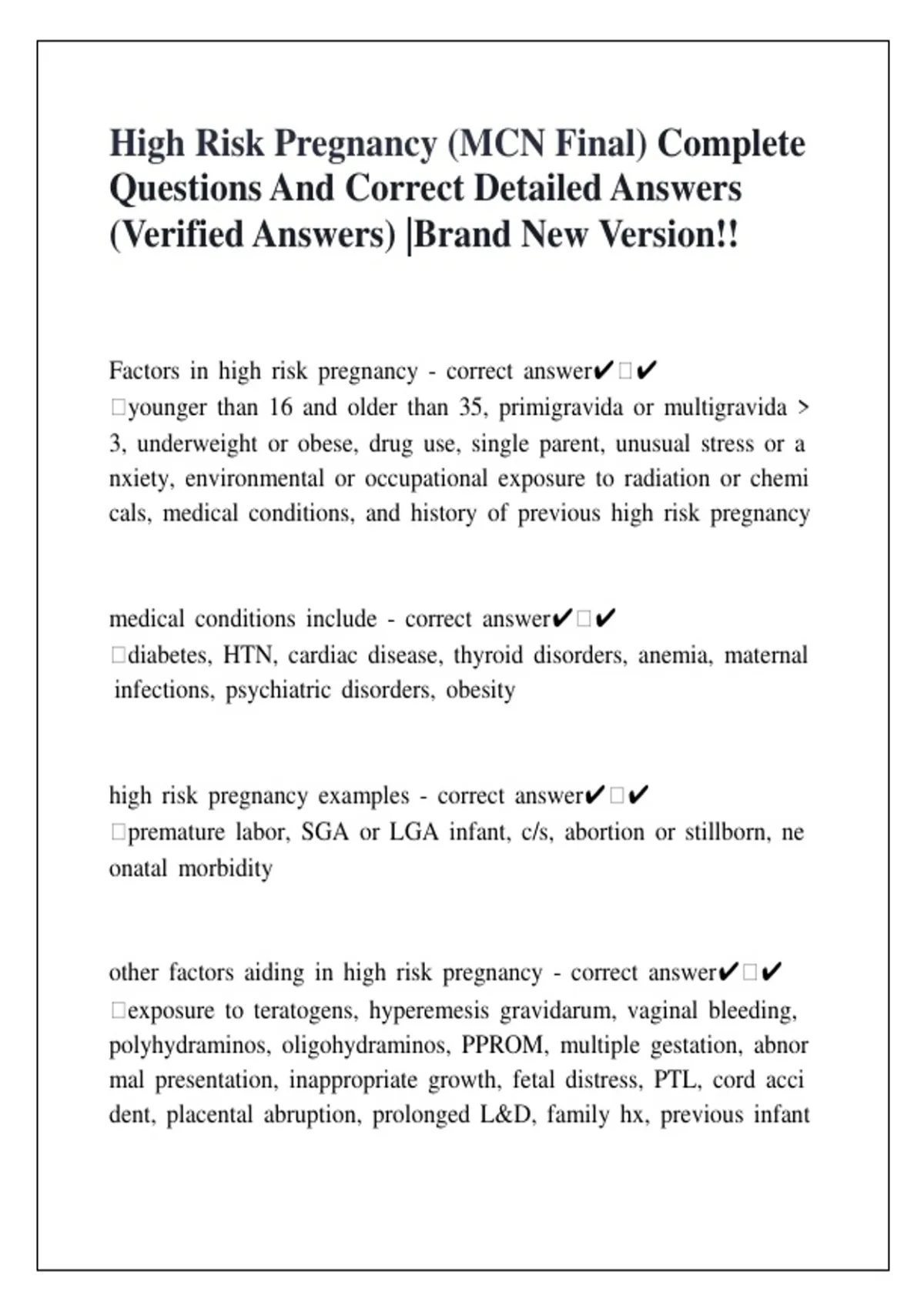 High Risk Pregnancy (MCN Final) Complete Questions And Correct Detailed Answers (Verified Answers) Brand