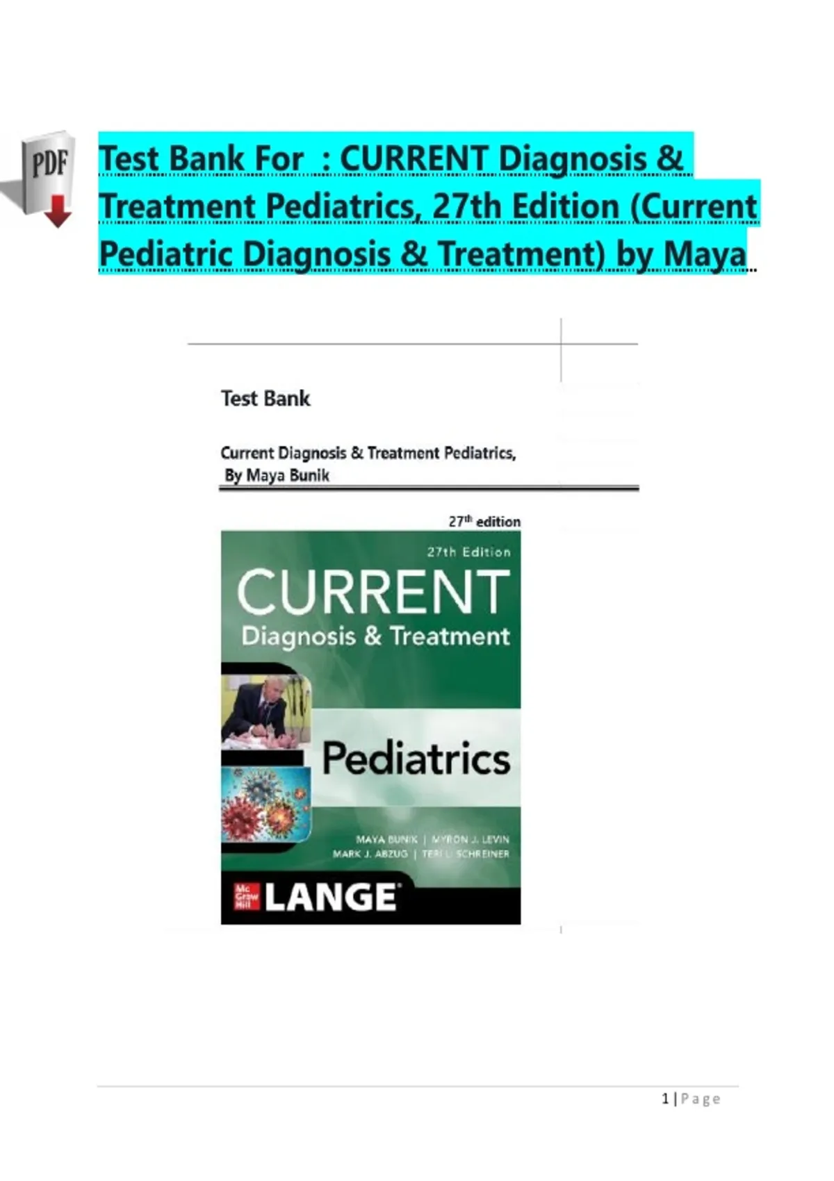 Test Bank For Current Diagnosis & Treatment Pediatrics, 27th Edition (Current Pediatric Diagnosis & Treatment) by Maya Bunik, Verified Chapters 1-46|| Newest Edition|ISBN: /27