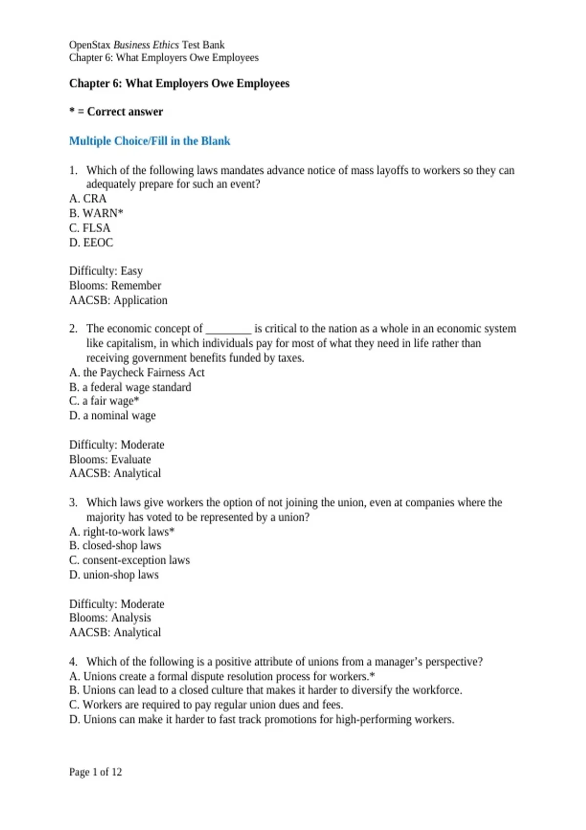 Strengthen your understanding of employer responsibilities, employee rights, workplace fairness, and ethical labor practices using this detailed Chapter 6 test bank with solution. This resource reinforces key business ethics principles, supports critical thinking about workplace policies and legal considerations, and helps improve performance on exams, quizzes, and course assessments.
