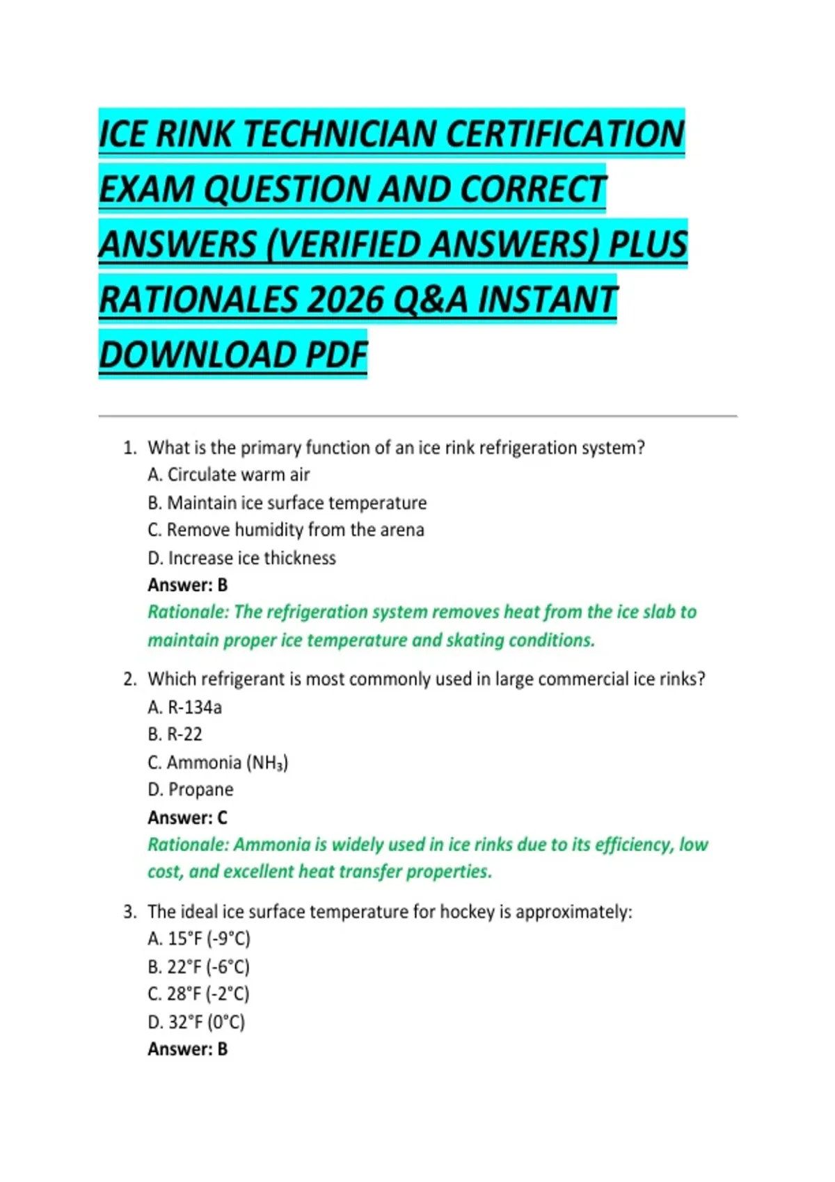 ICE RINK TECHNICIAN CERTIFICATION EXAM QUESTION AND CORRECT ANSWERS (VERIFIED ANSWERS) PLUS RATIONALES 2026 Q&A INSTANT DOWNLOAD PDF