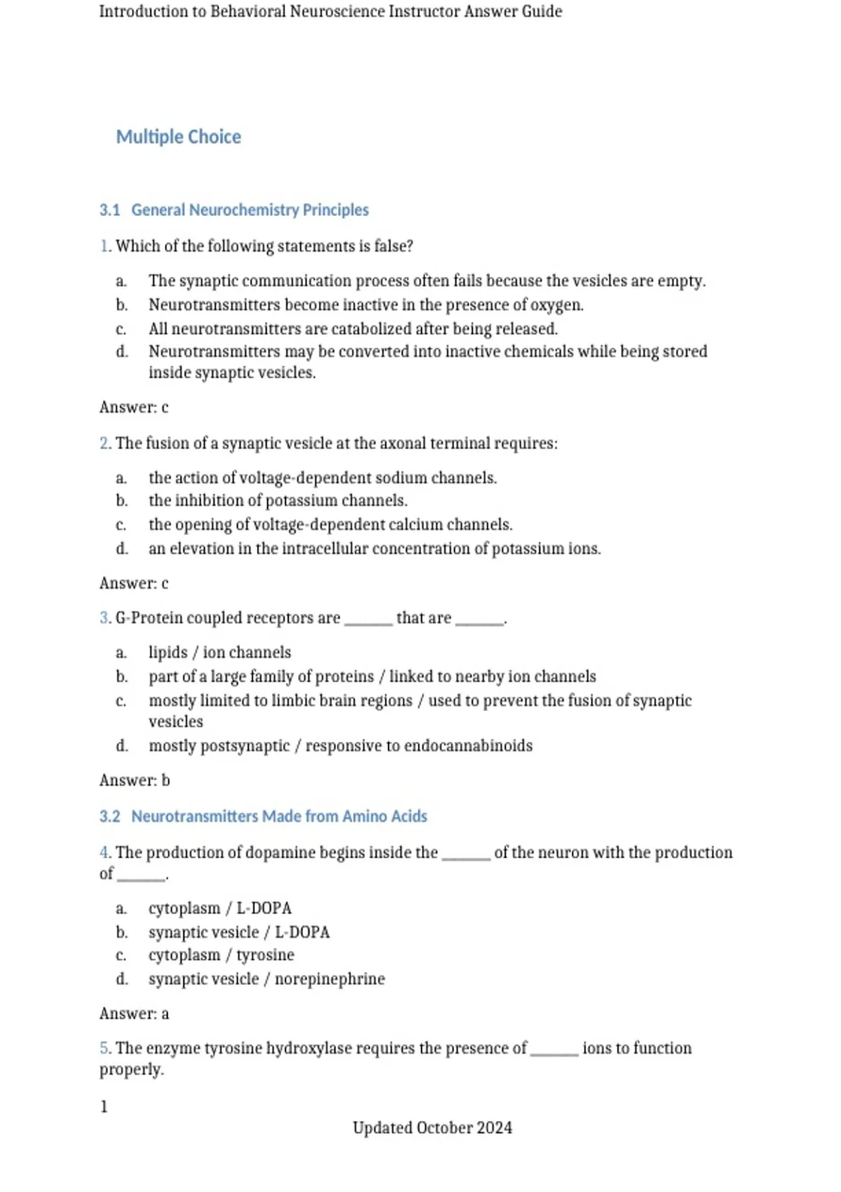 , Introduction to Behavioral Neuroscience Instructor Answer Guide