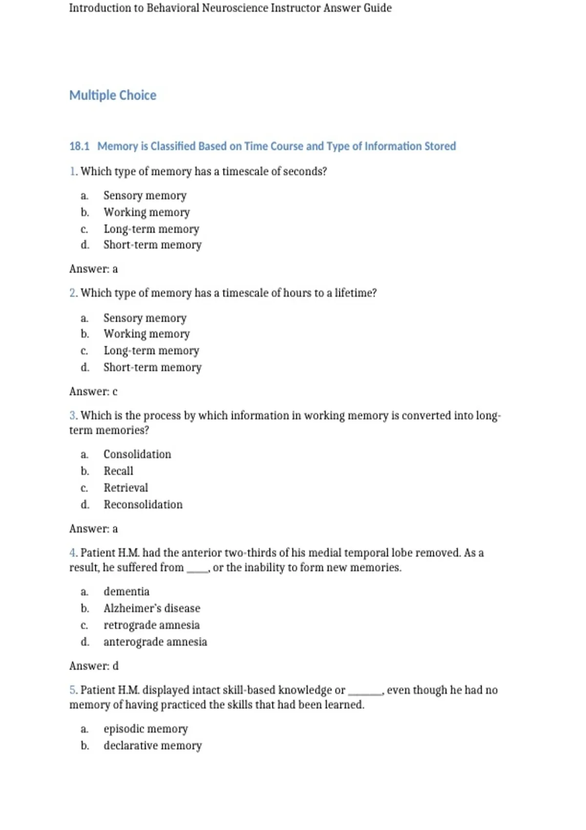 Introduction to Behavioral Neuroscience Instructor Answer Guide