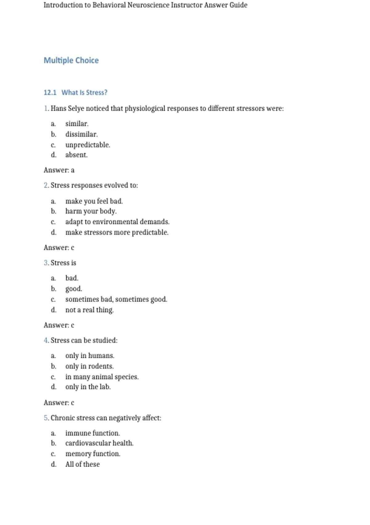 , Introduction to Behavioral Neuroscience Instructor Answer Guide