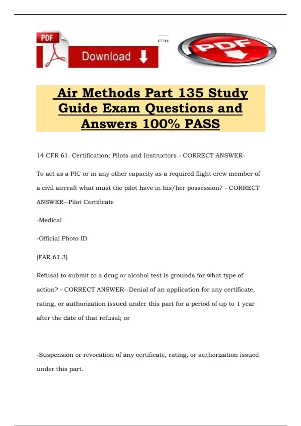 14 CFR 135: Drug and Alcohol - CORRECT ANSWER-