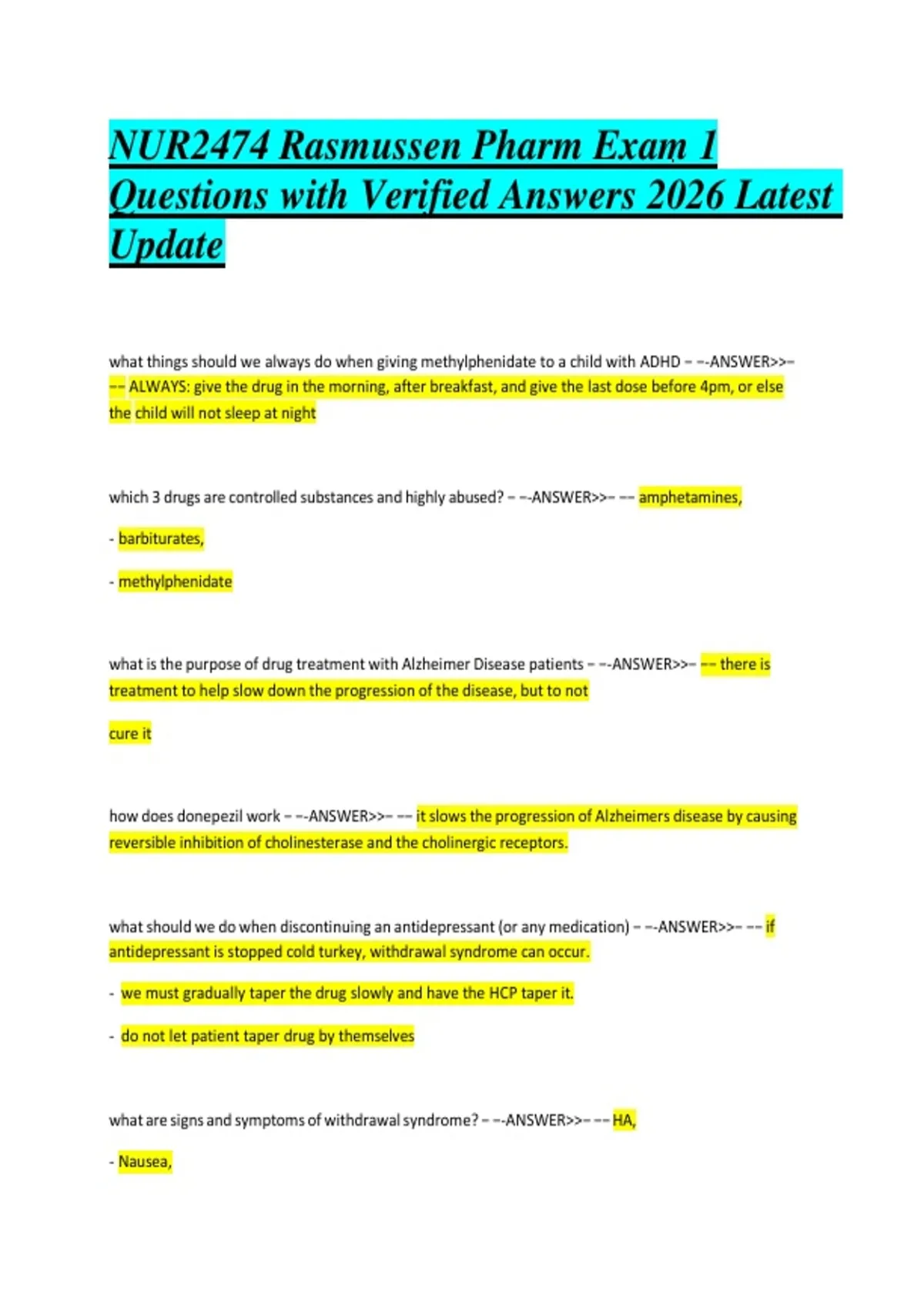 NUR2474 Rasmussen Pharm Exam 1 Questions with Verified Answers 2026 Latest Update