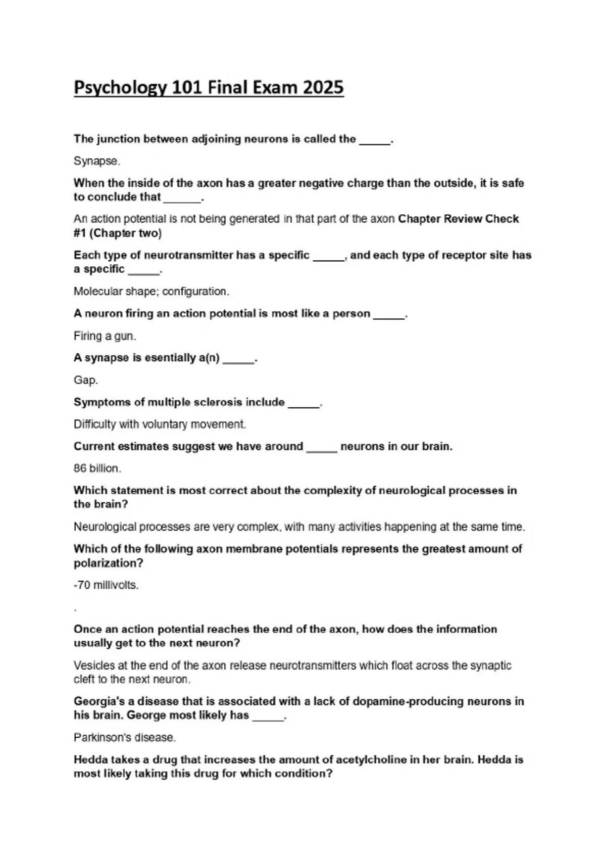 The junction between adjoining neurons is called the _____. Synapse. When the inside of the axon has a greater negative charge than the outside, it is safe to conclude that ______. An action potential is not being generated in that part of the axon Chapter Review Check #1 (Chapter two) Each type of neurotransmitter has a specific _____, and each type of receptor site has a specific _____. Molecular shape; configuration. A neuron firing an action potential is most like a person _____. Firing a gun. A synapse is esentially a(n) _____. Gap. Symptoms of multiple sclerosis include _____. Difficulty with voluntary movement. Current estimates suggest we have around _____ neurons in our brain. 86 billion. Which statement is most correct about the complexity of neurological processes in the brain? Neurological processes are very complex, with many activities happening at the same time. Which of the following axon membrane potentials represents the greatest amount of polarization? -70 millivolts. . Once an action potential reaches the end of the axon, how does the information usually get to the next neuron? Vesicles at the end of the axon release neurotransmitters which float across the synaptic cleft to the next neuron. Georgia's a disease that is associated with a lack of dopamine-producing neurons in his brain. George most likely has _____. Parkinson's disease. Hedda takes a drug that increases the amount of acetylcholine in her brain. Hedda is most likely taking this drug for which condition? Alzheimer's disease.