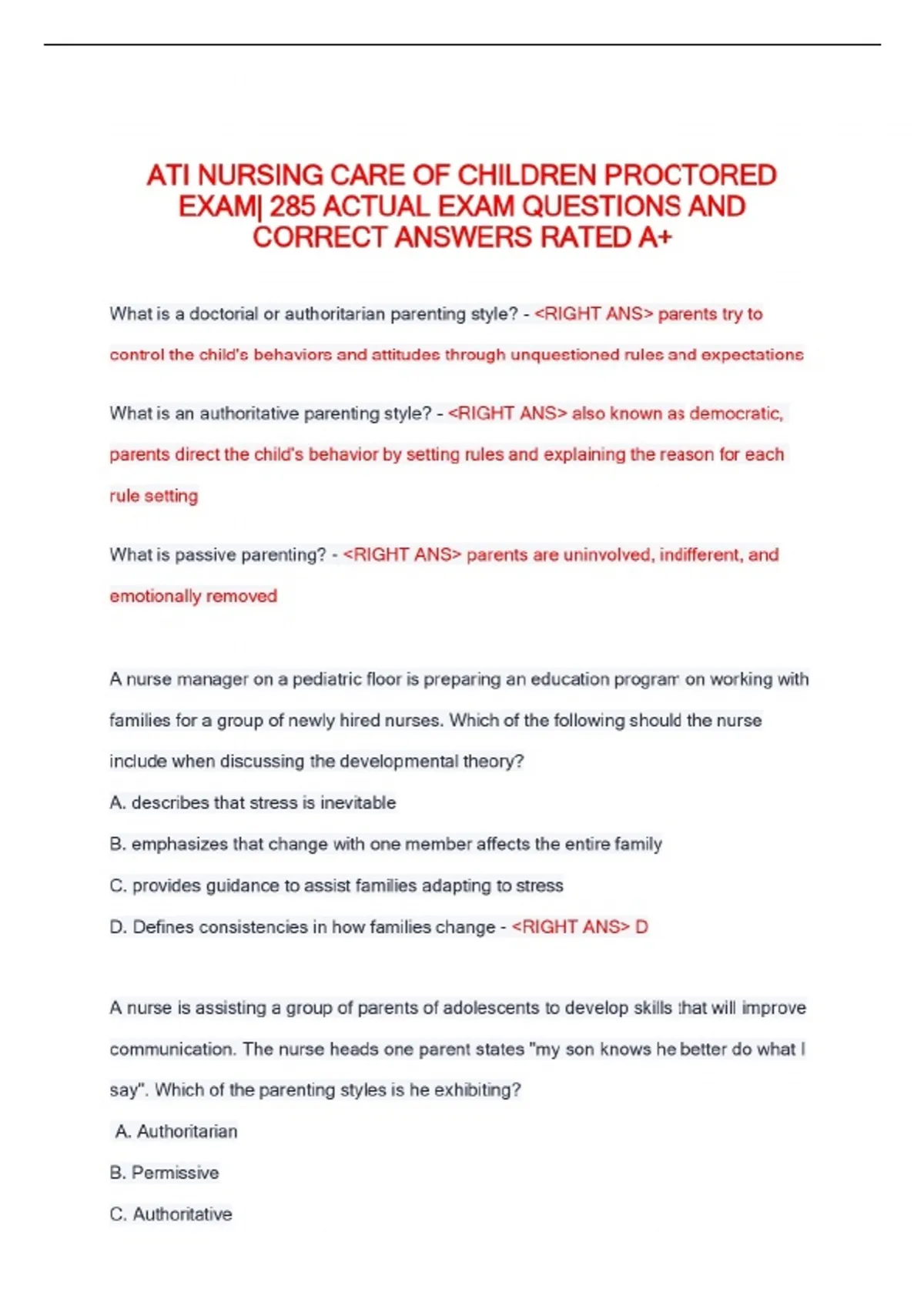 ATI NURSING CARE OF CHILDREN PROCTORED EXAM| 285 ACTUAL EXAM QUESTIONS AND CORRECT ANSWERS RATED A+ What is a doctorial or authoritarian parenting style? - RIGHT ANS parents try to control the child's behaviors and attitudes through unquestioned rules and expectations What is an authoritative parenting style? - RIGHT ANS also known as democratic, parents direct the child's behavior by setting rules and explaining the reason for each rule setting What is passive parenting? - RIGHT ANS parents are uninvolved, indifferent, and emotionally removed A nurse manager on a pediatric floor is preparing an education program on working with families for a group of newly hired nurses. Which of the following should the nurse include when discussing the developmental theory? A. describes that stress is inevitable B. emphasizes that change with one member affects the entire family C. provides guidance to assist families adapting to stress D. Defines consistencies in how families change - RIGHT ANS D A nurse is assisting a group of parents of adolescents to develop skills that will improve communication. The nurse heads one parent states "my son knows he better do what I say". Which of the parenting styles is he exhibiting? A. Authoritarian B. Permissive C. Authoritative D. Passive - RIGHT ANS A A nurse is performing family assessment. Which of the following should the nurse include? (select all that apply) A. medical history B. parents' education level C. child's physical growth D. Support systems E. Stressors - RIGHT ANS A, B, D, E What is the expected pulse rate of a newborn? - RIGHT ANS 80 to 180/min What is the expected pulse of a baby 1 week to 3 months? - RIGHT ANS 12 to 180/min What is the expected pulse of a child 3 months to 2 years? - RIGHT ANS 70 to 150/min What is the expected pulse of a child 2 to 10 years? - RIGHT ANS 60 to 110/min What is the expected pulse of a child 10 years and older? - RIGHT ANS 50 to 90/min What are the expected respirations fo a newborn to one year? - RIGHT ANS 30 to 35/min What are the expected respirations of a 1 to 2 year old? - RIGHT ANS 25 to 30/min What are the expected respirations of a 2 to 6 year old? - RIGHT ANS 21 to 25/min What are the expected respirations of a child 6 to 12 years old? - RIGHT ANS 19 to 21/min