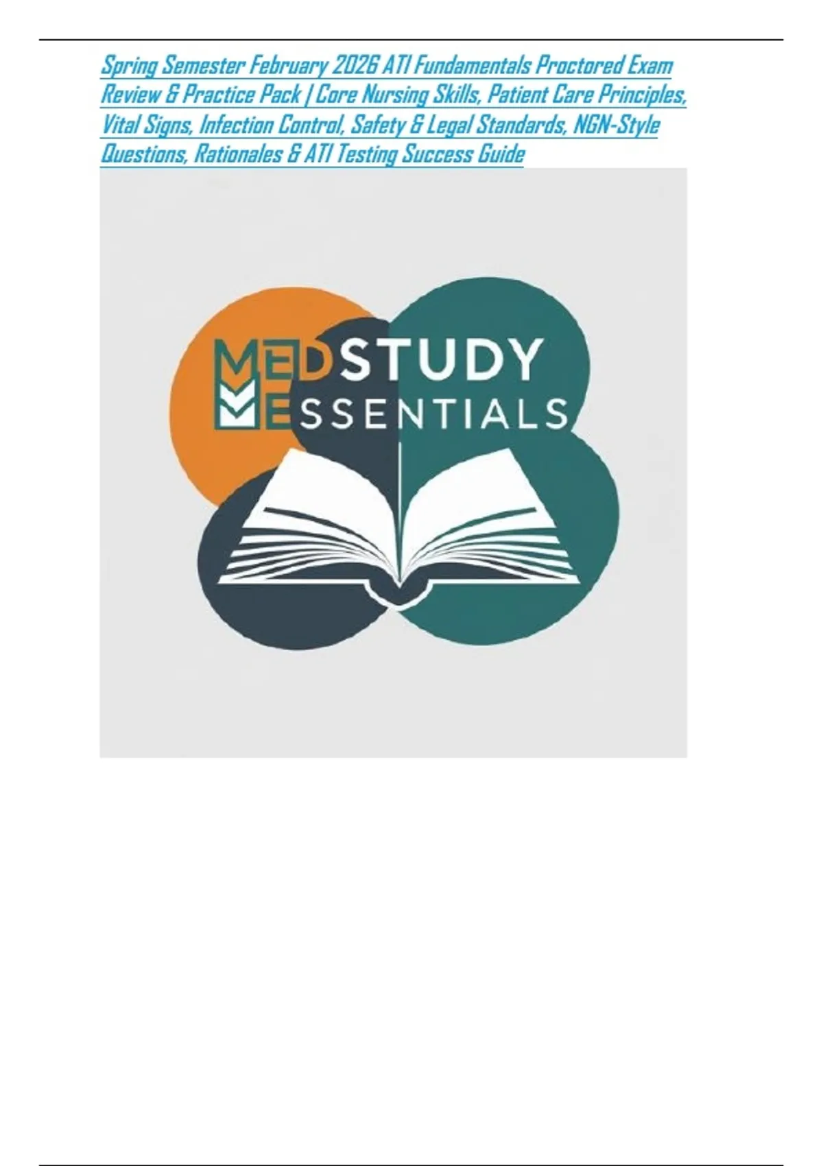 This ATI Fundamentals Proctored Exam Review & Practice Pack is fully updated for Spring Semester February 2026 and designed to help nursing students confidently succeed on ATI fundamentals proctored assessments. The guide covers core nursing skills, patient care principles, vital signs, infection prevention, safety measures, documentation, and legal and ethical standards, reinforced with Next Generation NCLEX (NGN)–style practice questions and clear, exam-focused rationales. Ideal for students preparing for ATI Fundamentals proctored exams or nursing coursework, this resource supports efficient study, strengthens clinical judgment, and builds confidence for fundamentals nursing exam success.