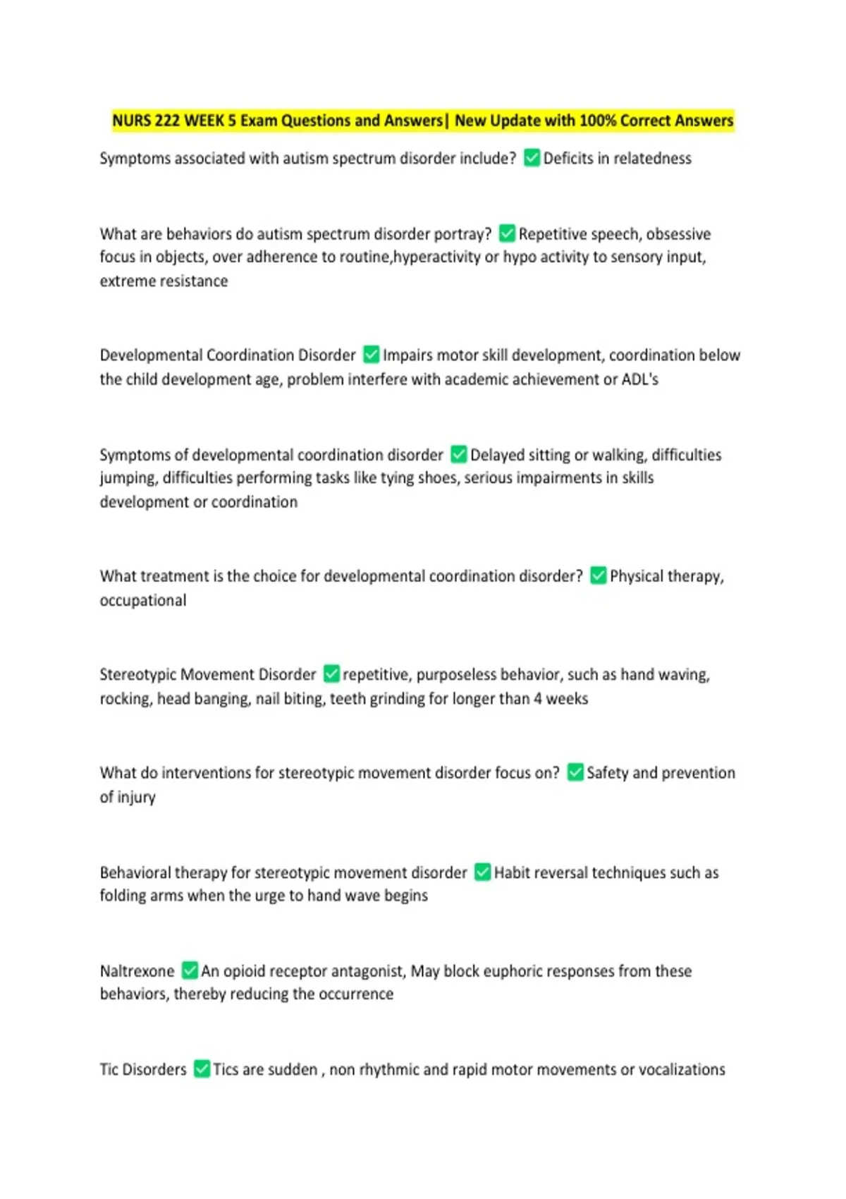 NURS 222 WEEK 5 Exam Questions and Answers| New Update with 100% Correct Answers
