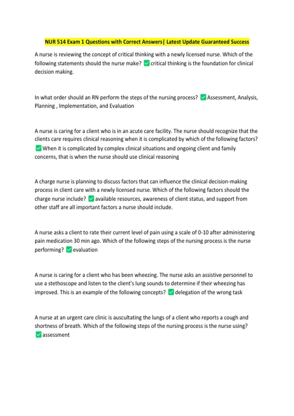 NUR 514 Exam 1 Questions with Correct Answers| Latest Update Guaranteed Success