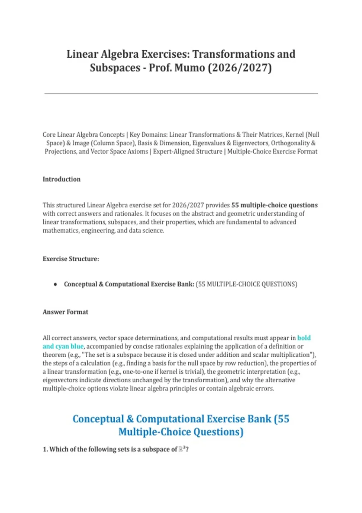 This structured Linear Algebra exercise set for 2026/2027 provides 55 multiple-choice questions