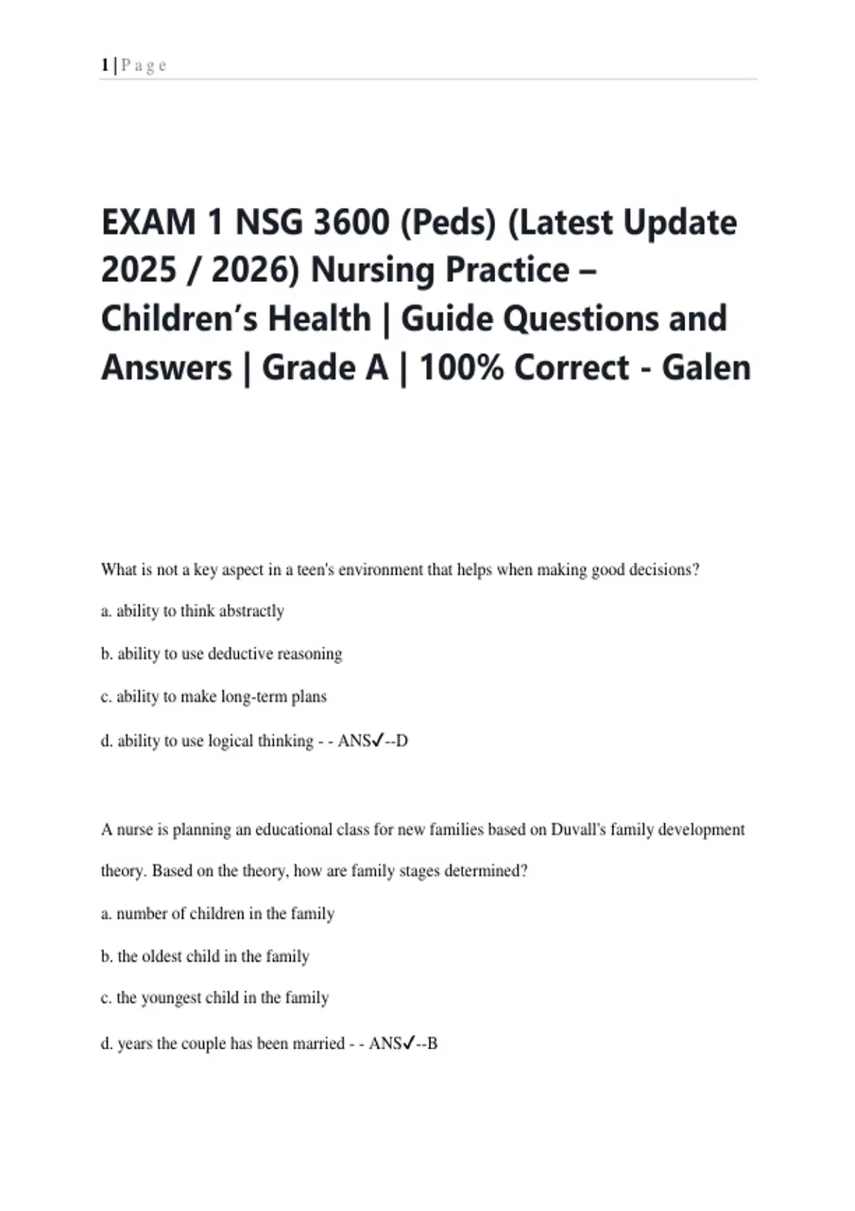 EXAM 1 NSG 3600 (Peds) (Latest Update